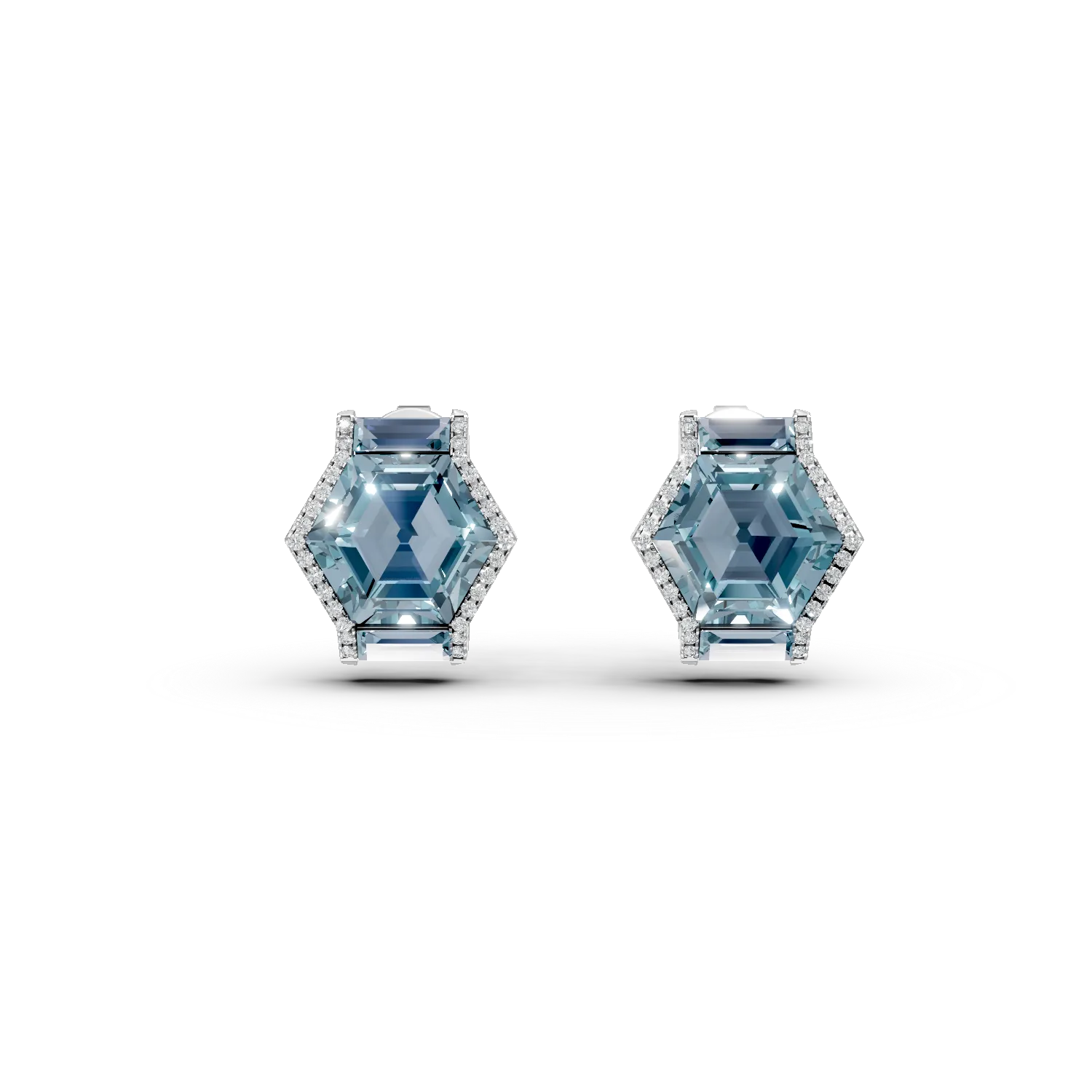 Stralucirea sofisticata a acestor cercei stud din aur alb este pusa in valoare de topazele albastre de 14.3ct cu taietura hexagonala si baguette, care atrag privirea prin intensitatea culorii si claritatea lor exceptionala. Montura fina, impodobita cu diamante de 0.2ct, adauga o luminozitate delicata, completand armonios designul modern si rafinat. Acesti cercei sunt creati pentru a insoti cu eleganta aparitiile speciale si pentru a ramane piese de referinta in orice colectie. Descopera rafinamentul care trece dincolo de timp si lasa TEILOR sa iti fie semnatura de stil.