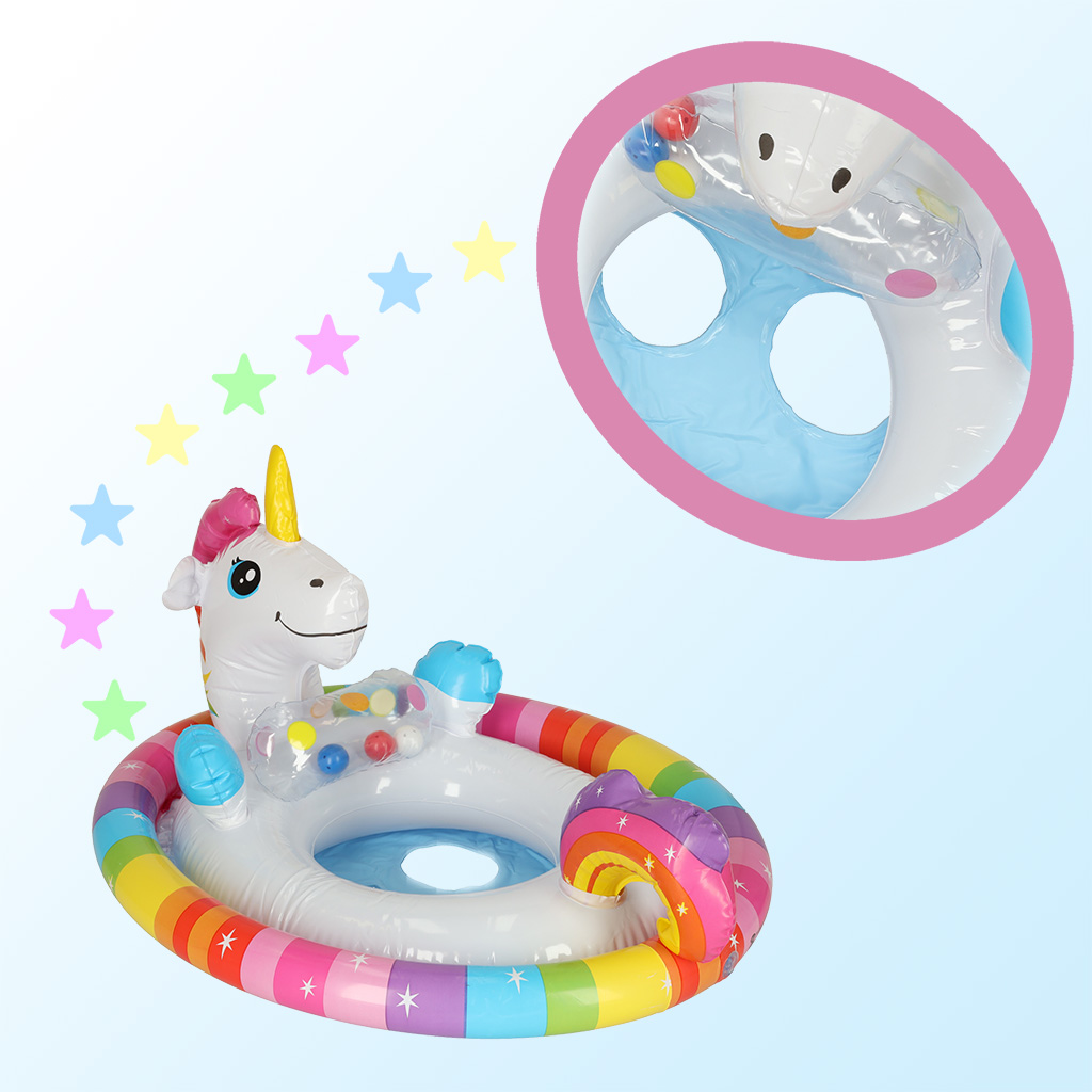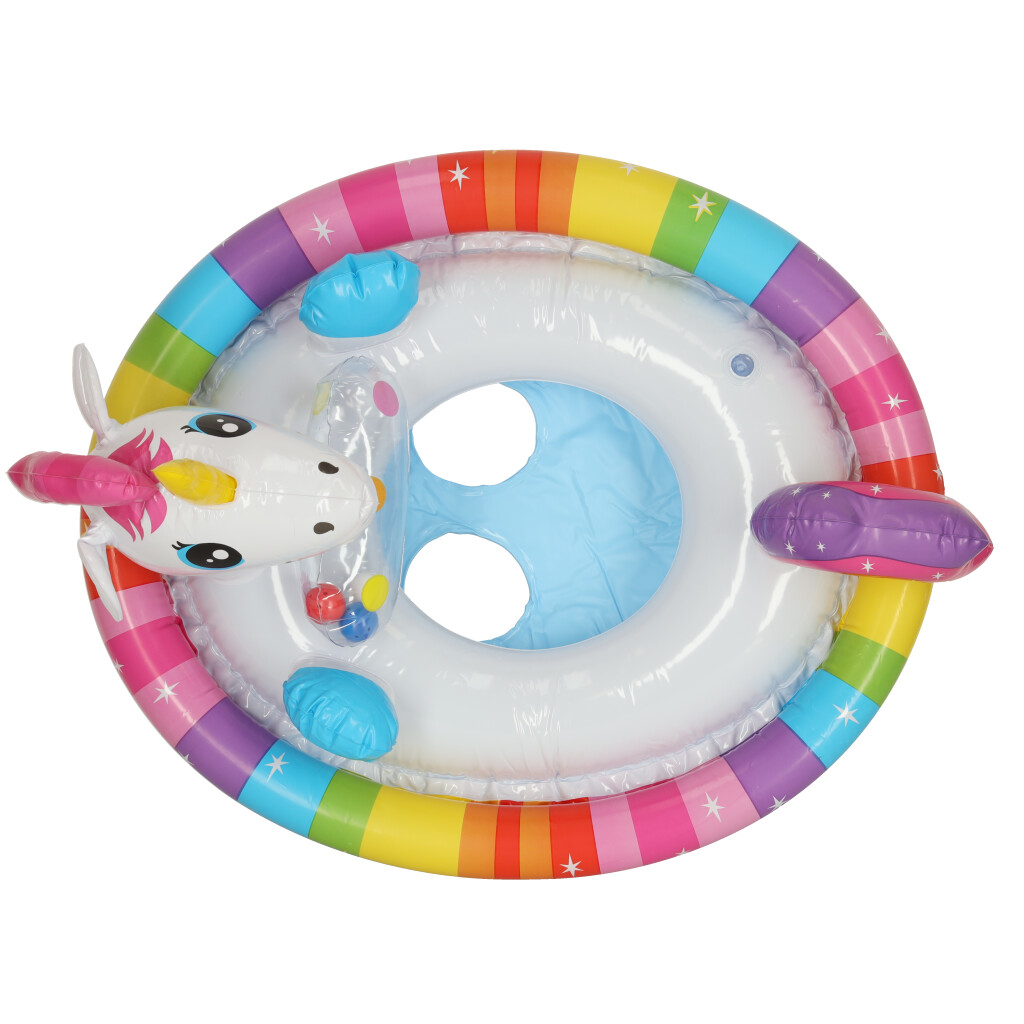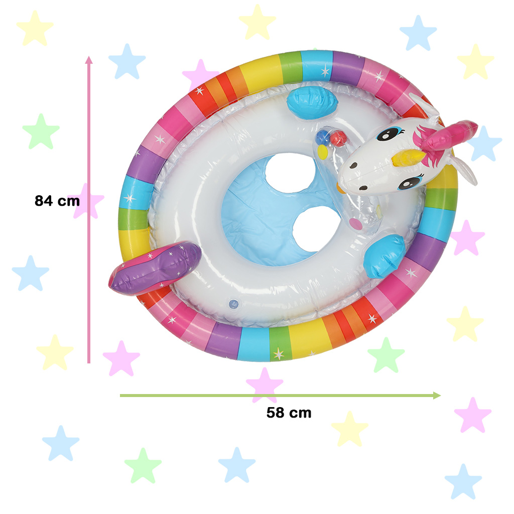 Colac de inot gonflabil, cu scaun, pentru bebelusi, cu unicorn, greutate maxima 23 kg, 3-4 ani O excursie la apa cu copiii? Mergeti impreuna la piscina? Atunci copilul dumneavoastra va avea cu siguranta nevoie de un inel de inot pentru a-l ajuta sa se simta ca un peste in apa! Inelul de inot colorat in forma de unicorn il va incuraja cu siguranta pe cel mic sa intre in apa si sa plece intr-o aventura acvatica! In plus, o forma de roata atat de adorabila va atrage cu siguranta multa ate
