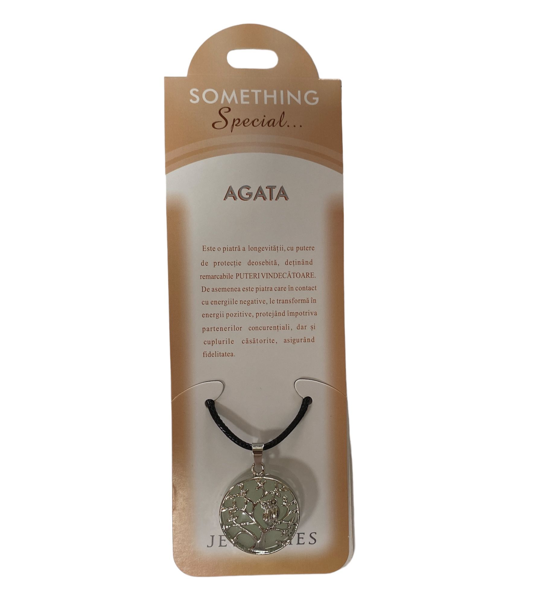 Colier cu pom si bufnita din piatra semipretioasa AGATA pe carton, diametru: 2.5 cm