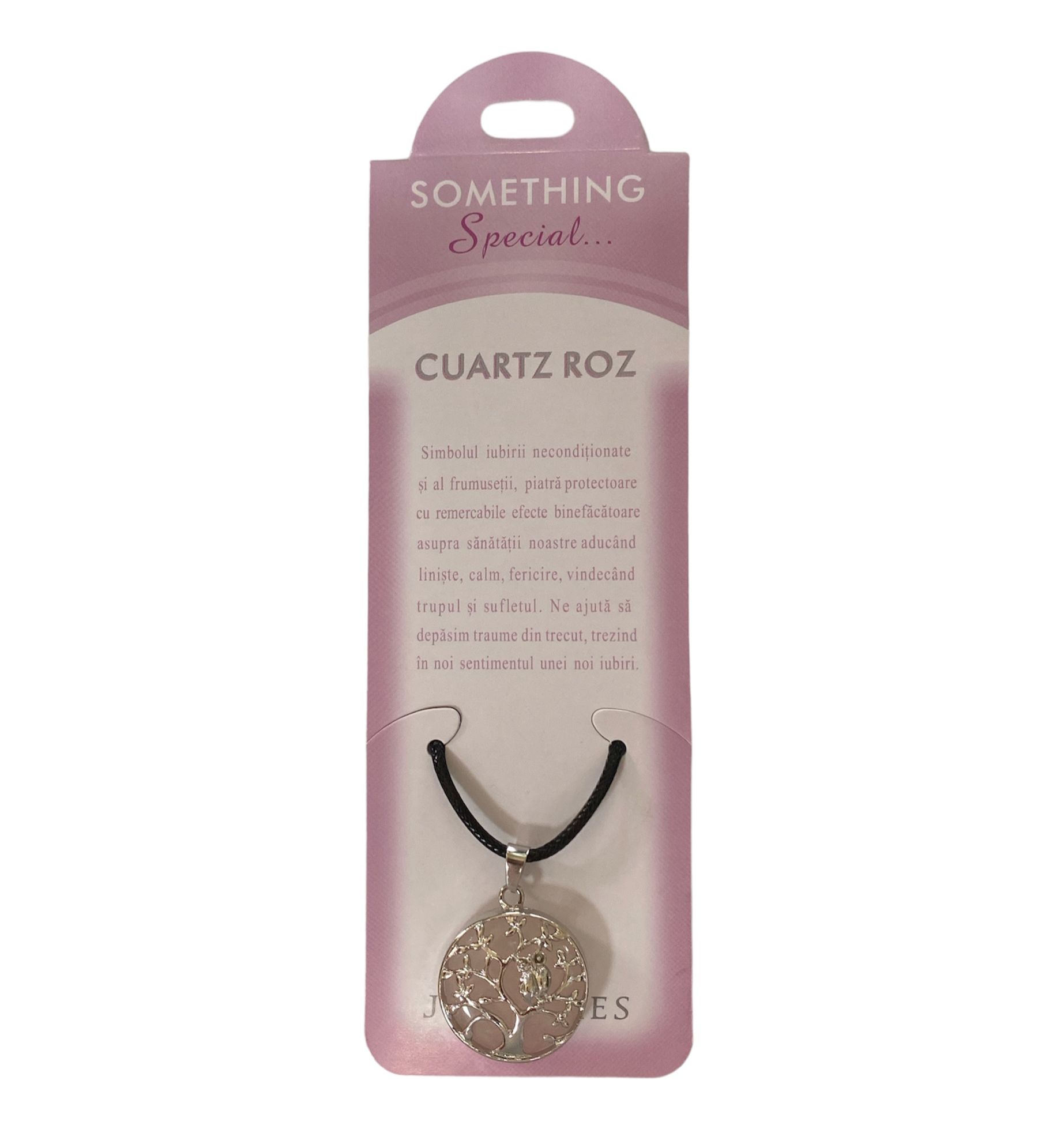 Colier cu pom si bufnita din piatra semipretioasa CUARTZ ROZ pe carton, diametru: 2.5 cm