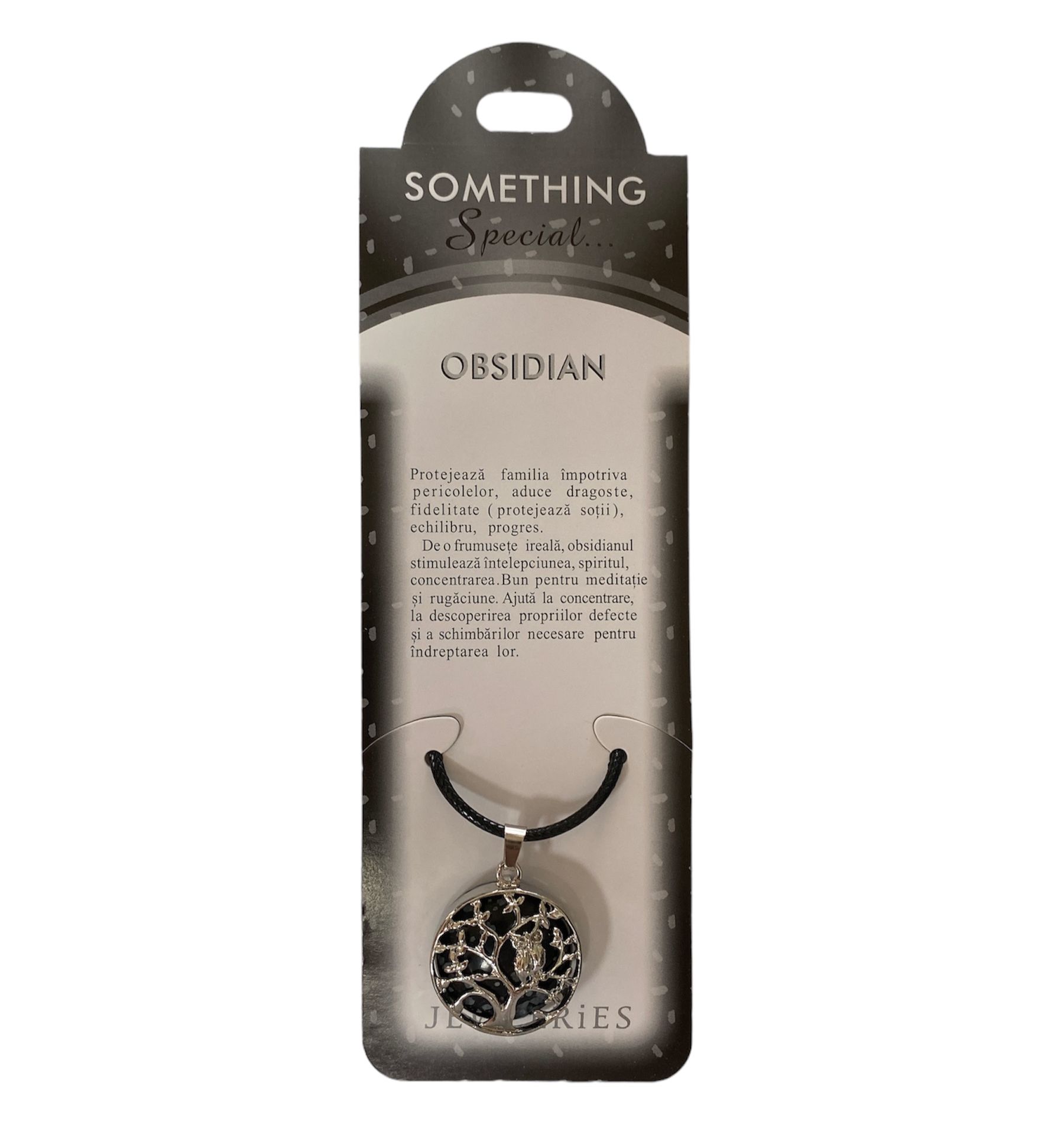 Colier cu pom si bufnita din piatra semipretioasa OBSIDIAN pe carton, diametru: 2.5 cm