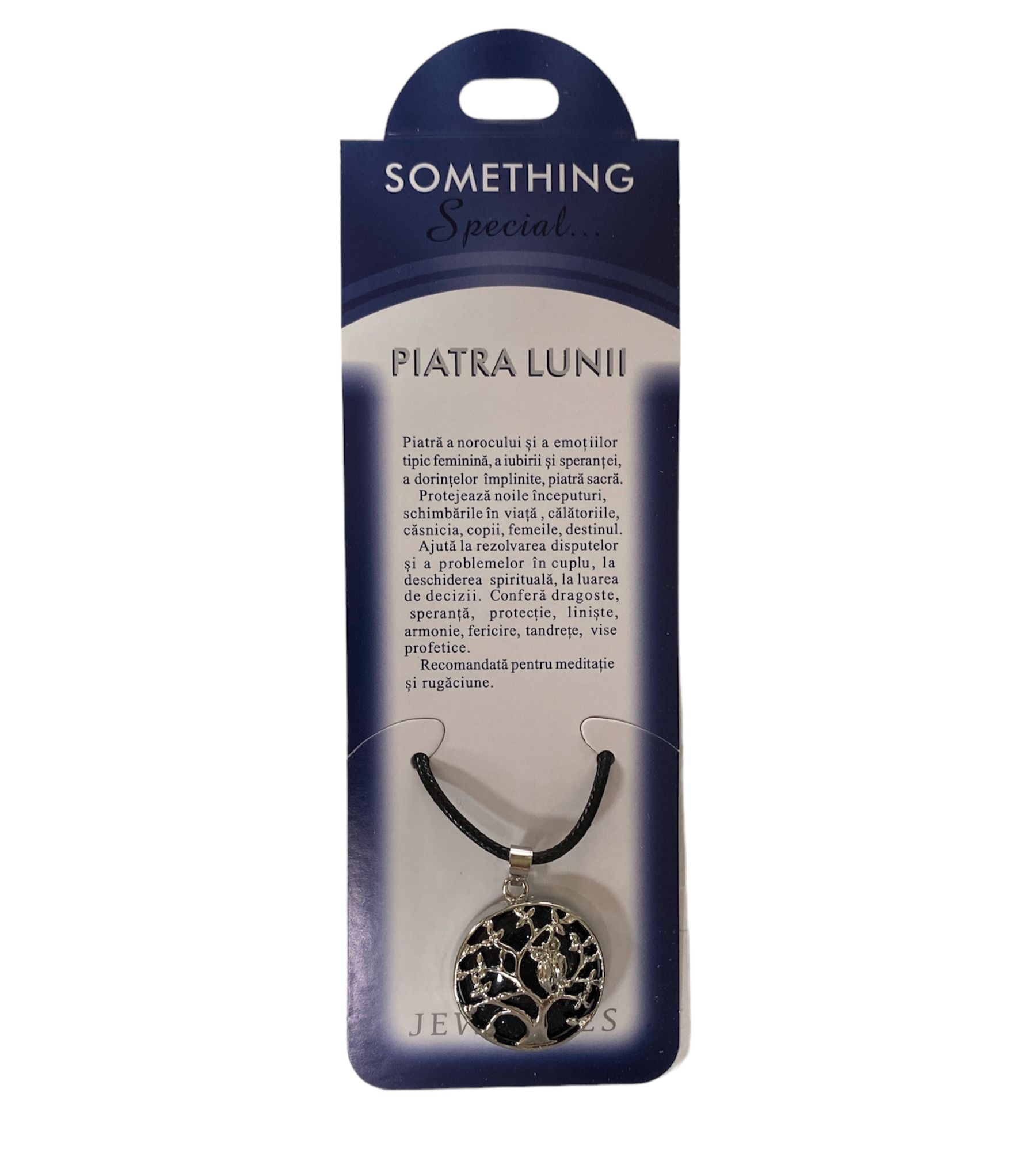Colier cu pom si bufnita din piatra semipretioasa PIATRA LUNII pe carton, diametru: 2.5 cm