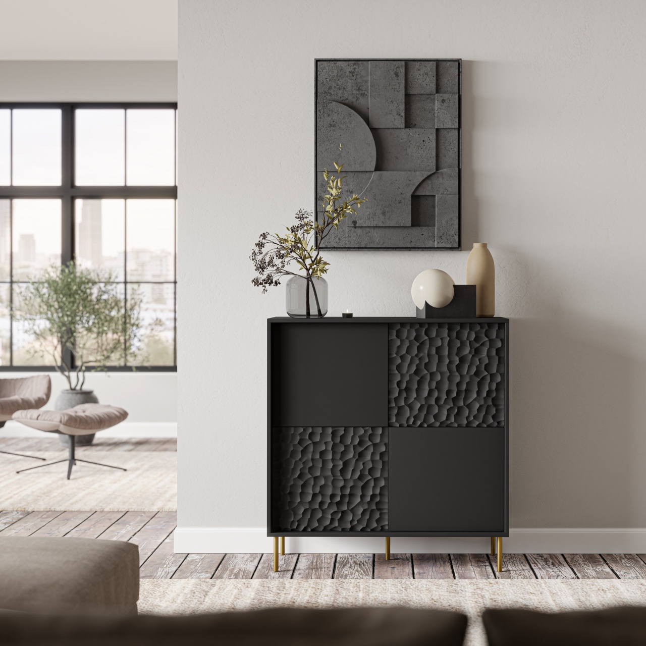 Comoda Bullet impresionează prin designul său simplu și modern, fiind o alegere ideală pentru cei care apreciază eleganța și funcționalitatea în amenajarea spațiului interior. Concepută pentru a se integra armonios în orice decor, această comodă oferă o soluție practică pentru organizarea și optimizarea spațiului. Cu o suprafață generoasă deasupra, comoda poate găzdui cu ușurință obiectele decorative preferate, aducând astfel un plus de rafinament și confort în încăpere. Colecția Bullet se remarcă prin versatilitatea sa, potrivindu-se perfect unei game variate de stiluri interioare, de la cele moderne și contemporane până la cele clasice și tradiționale. Dimensiuni: Lățime: 41 cm Lungime: 100 cm Înălțime: 105 cm Detalii tehnice: – materiale: placă de mobilier laminat, MDF furniruit, metal; – designul are formă de adâncituri pe fronturi (fagure); – picioarele sunt realizate din metal, nuanța auriu. Culoare: Negru/auriu Produsul nu este montat, este destinat pentru auto-asamblare. Instrucțiunile de montaj vin în colet.