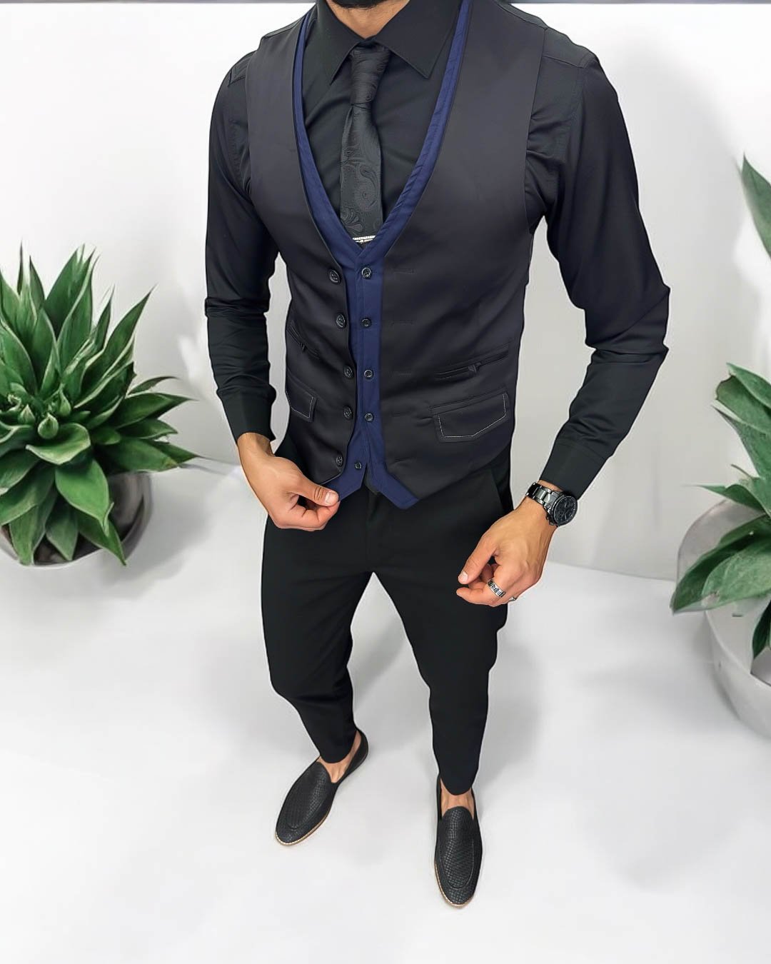 Compleu barbati Vesta + Pantaloni Compleu barbati office - compleu fashion - compleu elegant - compleu nunta - compleu botez Compleu Slim fit Material pantaloni conici: 63% poliester 35% vascoza 2% elastanAccesoriul nu este inclusCompleul cuprinde urmatoarele piese: Vesta Pantaloni Manechinul are 180 si 70kg si a pozat cu marimea 42. Dimensiune pantaloni Talie (cm) Lungime (cm) 30 39 102 31 40.5 102 32 42 102 33 43.5 102 34 45 102 36 46.5 102 Dimensiune vesta Talie (cm) Lungime (cm) 30 45 65 31 47 65 32 49 66 33 51 67 34 53 67 36 55 68
