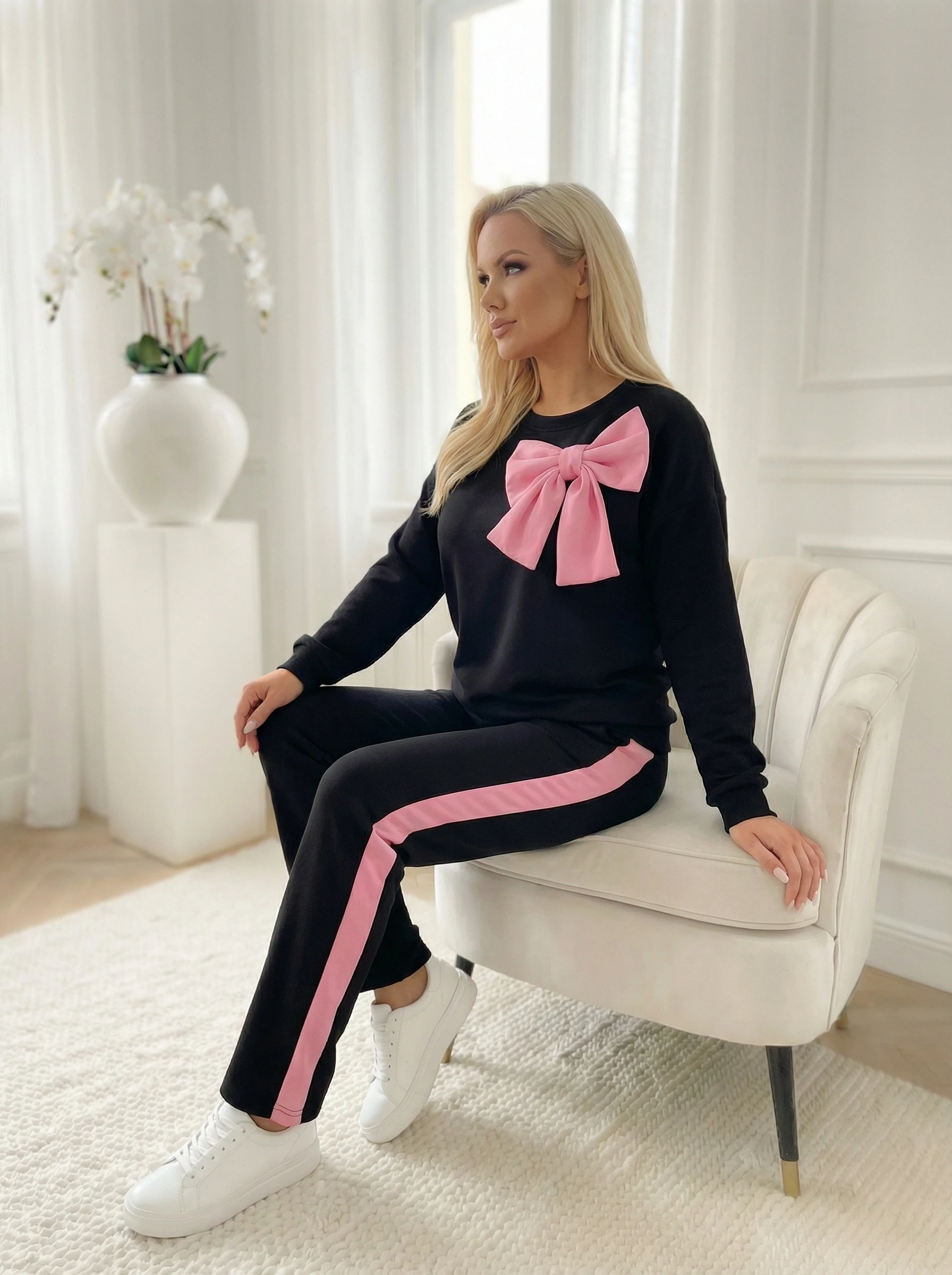 Compleu dama negru cu funda roz statement, ideal pentru un look casual chic cu personalitate. Setul este compus din bluza lejera cu funda supradimensionata aplicata frontal si pantaloni lejeri cu dunga laterala, pentru un contrast feminin si modern. Croia