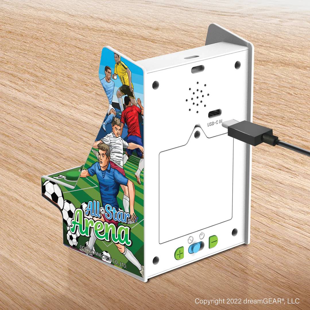 All-Star Arena Nano Player aduce în prim-plan versiuni complet jucabile ale unor titluri clasice de la Jaleco™, incluzând GOAL!™, BASES LOADED™ 1, 2, 3 & 4, RACKET ATTACK™ și HOOPS™. Cu un ecran color de 2.4”, această consolă mini retro afișează clar toate cele 7 titluri și este proiectată ergonomic pentru ore întregi de jocuri captivante./nCaracteristici Principale:/n/n7 titluri Jaleco™ licențiate oficial + 200 de jocuri bonus în stil retro: Include GOAL!™, BASES LOADED™ 1, 2, 3 & 4, RACKET ATTACK™ și HOOPS™./nEcran color de 2.4”: Experimentează grafica vibrantă și clară pe acest ecran de înaltă calitate./nDifuzor încorporat cu control al volumului: Bucură-te de sunet clar și puternic datorită difuzorului orientat spre spate, cu control de volum ușor de utilizat./nAlimentare versatilă: Funcționează fie cu 4 baterii AAA (neincluse), fie cu orice cablu USB-C (neinclus), oferindu-ți flexibilitate în utilizare./nJoacă-te acasă sau în mișcare: Portabilitatea și dimensiunile compacte fac din această consolă un companion ideal pentru orice locație./nPerfect pentru orice cameră de jocuri, birou sau vitrină: Un element de colecție care adaugă valoare și stil oricărui spațiu./n/nAvantaje pentru Utilizatori:/n/nExperiența arcade autentică: Reînvie bucuria și provocarea jocurilor arcade clasice, ideale pentru toate vârstele./nPortabilitate și versatilitate: Dimensiunile compacte și opțiunile multiple de alimentare fac din această consolă un companion ideal pentru orice locație./nCadou ideal: Perfect pentru colecționari și pasionați de jocuri video, oferind ore întregi de distracție captivantă./n