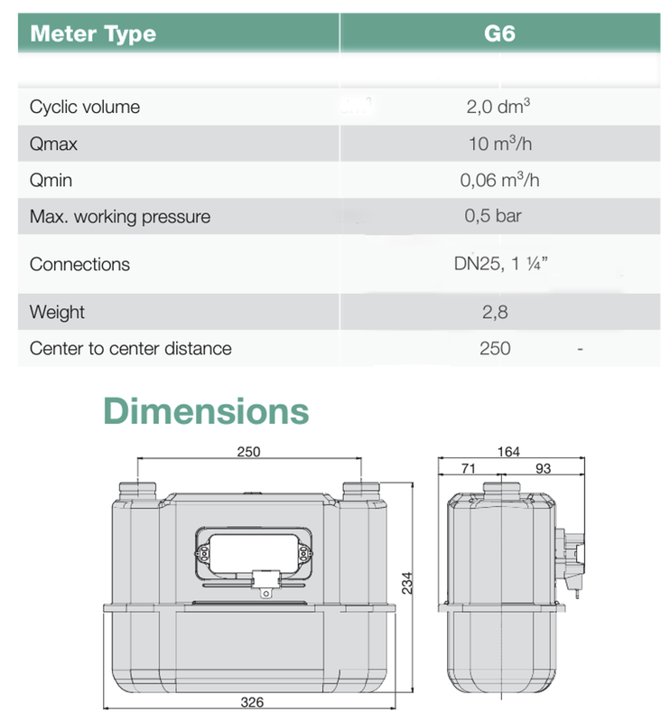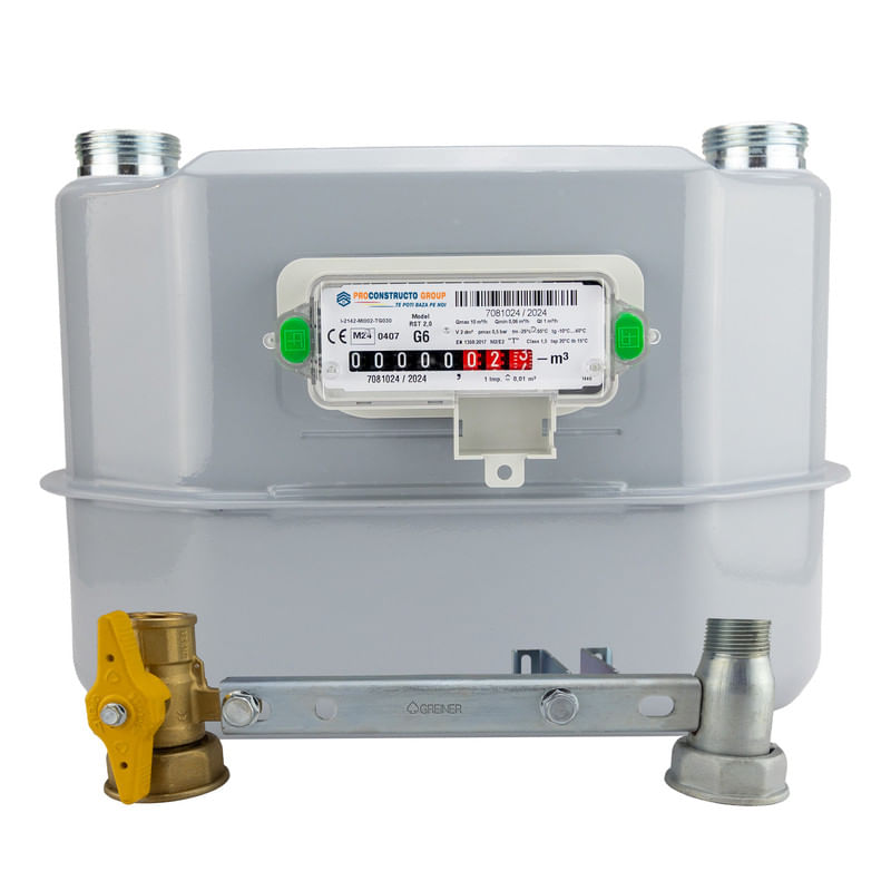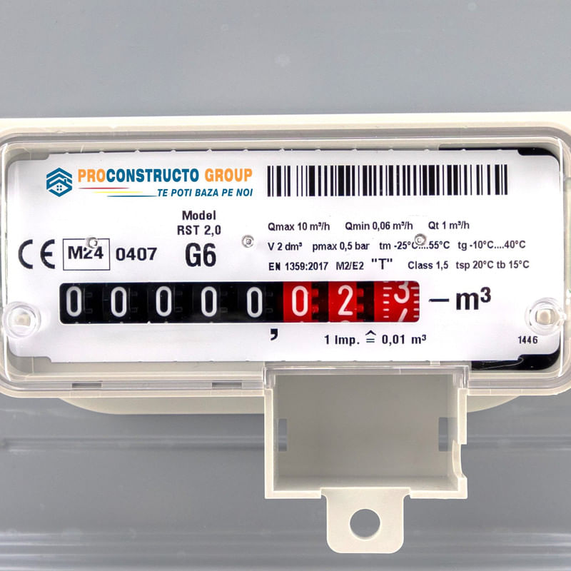 Contor de gaz G6 mecanic 10 mc/h, Proconstructo Group, 250 mm intre axe, racorduri 1 1/4/n /nCreat pentru tine/nContorul de gaz G6 este special proiectat pentru uz rezidential in case mai mari sau pentru locatii comerciale cu un consum moderat. Este ideal pentru instalatiile cu un consum mediu de aproximativ 6 metri cubi pe ora. Denumirea G6 provine chiar de la acest debit de referinta de 6 mc/h. Totusi, contorul este capabil sa gestioneze un debit maxim de pana la 10 metri cubi pe ora. Daca suma consumului maxim al tuturor aparatelor de gaz din locatia ta se apropie de aceasta limita, este recomandat sa iei in considerare trecerea la un contor de capacitate superioara, deoarece 10 m³/h reprezinta limita maxima pentru acest model, iar depasirea acesteia poate afecta performanta si precizia masuratorilor./n /n /n/nBeneficii:/n/n Stabilitate ridicata de masurare: Asigura masuratori precise si stabile pe termen lung, chiar si in conditii variate de operare./n Absorbtie redusa de zgomot si presiune: Functionare silentioasa si eficienta./n Rezistenta la temperaturi ridicate: Functionare eficienta chiar si in medii cu temperaturi extreme, datorita constructiei robuste./n Design robust si fiabil: Carcasa din tabla de otel zincata si acoperita cu pulbere poliesterica ofera durabilitate si rezistenta in conditii dificile./n Compatibilitate larga: Potrivit pentru utilizarea cu gaze naturale, propan, butan si alte gaze necorozive, inclusiv amestecuri de gaz natural si hidrogen, fiind pregatit pentru hidrogen din fabrica./n Optiuni suplimentare: Echipat cu un magnet pentru cuplare si compatibil cu emitatoare de impulsuri cu frecventa joasa sau module de comunicatie./n Scaderea susceptibilitatii la deteriorare: Designul contorului minimizeaza riscul de deteriorare in urma socurilor sau stresului mecanic./n Compact si usor: Dimensiunile reduse si greutatea scazuta fac din acest contor o solutie eficienta pentru instalare in spatii limitate./n Certificari internationale: Conformitatea cu reglementarile internationale (EN1359, MID) ofera incredere suplimentara in calitatea si siguranta contorului./n/n /n/n /nCaracteristici principale:/n/n Membrana: Material sintetic de inalta calitate care asigura sensibilitate si performanta excelenta chiar si la debite minime de gaz./n Carcasa: Construita din tabla de otel zincat, adanc embosata si acoperita cu pulbere, oferind protectie excelenta impotriva coroziunii si rezistenta la temperaturi ridicate./n Precizie: Clasa de precizie 1.5, conform standardului EN 1359:2017, garantata de un proces automat de calibrare si control strict al calitatii./n Debit: Debit minim de 0,06 mc/h, debit de tranzitie de 1 mc/h si debit maxim de 10 mc/h./n Presiune: Presiunea maxima de operare este de 0,5 bar./n Temperatura de operare: Intre -25°C si +55°C./n Racorduri: 1/4 filet exterior conform ISO228-1./n Dimensiuni: Lungime 370 mm, latime 330 mm, inaltime 200 mm./n Greutate: 5 kg./n Volum ciclic: 2,0 Litri./n Structura carcasei: Carcasa este construita din doua parti (superioara si inferioara), asamblate cu un adeziv special si un inel metalic presat la rece, asigurand o etansare si o rezistenta superioara./n/n /n/n /n/n /n /n /n /n /n /n /n /n /n/n/n /n /n /n /n /n Cum sa Determini daca contorul de Gaz G6 este Potrivit pentru Tine/n Pentru a sti daca contorul de gaz G6, cu un debit maxim de 10 mc/h, este potrivit pentru locatia ta, trebuie sa iti evaluezi nevoile de consum. Iata cateva criterii esentiale:/n Numarul de aparate care utilizeaza gaz: Daca ai mai multe aparate care functioneaza pe gaz, cum ar fi o centrala termica, cuptor pe gaz si plita, contorul G6 poate gestiona cu usurinta consumul cumulat al acestora, oferind un debit suficient pentru a preveni scaderile de performanta./n Marimea locuintei: Pentru case unifamiliale mari sau cladiri cu mai multe bai si bucatarii, contorul G6 este ideal. Asigura un debit de gaz constant si precis, chiar si in locuinte cu mai multe zone de consum./n Verificarea consumului maxim: Centralele termice si alte aparate mari pot avea un consum ridicat. Daca consumul maxim al echipamentelor din locatia ta se apropie de 10 mc/h, contorul G6 este o alegere potrivita./n Exemple de utilizare:/n /n Case unifamiliale mari: Pentru locuinte cu centrale termice de mare capacitate sau mai multe aparate de gaz, contorul G6 asigura un debit suficient pentru toate necesitatile./n Cladiri comerciale mici: Daca detii o mica afacere care utilizeaza gaz pentru incalzire sau gatit, contorul G6 este optim pentru a mentine o functionare eficienta./n /n Acest contor ofera precizia si fiabilitatea necesare pentru locatiile cu un consum mai mare de gaz./n /n /n /n /n /n/n /n/n /nFunctionare:/nDiferenta de presiune intre admisie si iesire determina umplerea si golirea ciclica a celor patru camere de masurare prin miscarea alternativa a membranei deformabile. Aceasta miscare este transformata in rotatia angrenajului prin intermediul sistemului de masurare mecanic, care consta din supape si cuplaj biela/manivela. Rotatia angrenajului este transmisa la indexul mecanic din partea din fata a contorului, indicand consumul de volum. Ultima roata poate fi echipata cu un magnet care transmite semnalul de rotatie folosind un senzor magnetic de impuls cu comutator reed./n /nContorul de gaz G6 este un instrument de masurare volumetric, conceput pentru aplicatii rezidentiale si comerciale, oferind precizie si fiabilitate in masurarea consumului de gaz. Face parte din gama de contoare cu membrana si este proiectat sa indeplineasca cele mai ridicate cerinte in ceea ce priveste acuratetea masuratorilor si durabilitatea, conform standardului EN 1359:2017./n /n/n /nSpecificatii tehnice:/n/n Model: G6 RST 2.0/n Brand: Proconstructo Group/n Clasa de precizie: 1.5/n Presiunea maxima de operare: Pmax = 0,5 bar/n Debit minim: Qmin = 0,06 mc/h/n Debit tranzitie: Qt = 1 mc/h/n Debit maxim: Qmax = 10 mc/h/n Dimensiuni: Lungime 370 mm, latime 330 mm, inaltime 200 mm/n Racorduri: 1 1/4 f