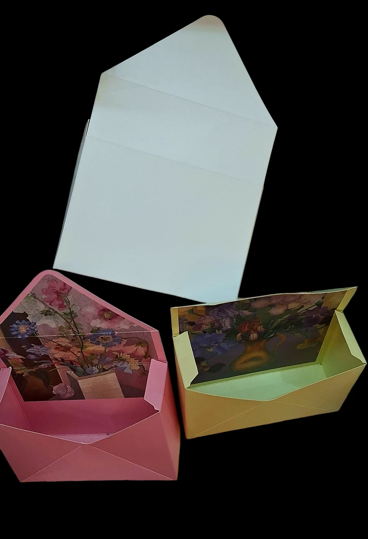 Cutie carton eleganta florala forma plic alb Ideala pentru aranjamente florale Dimenziune: 25cmx18cmx7cm Accesorizata cu decor interior floral Disponibila pe 3 culori: crem, alb, roz