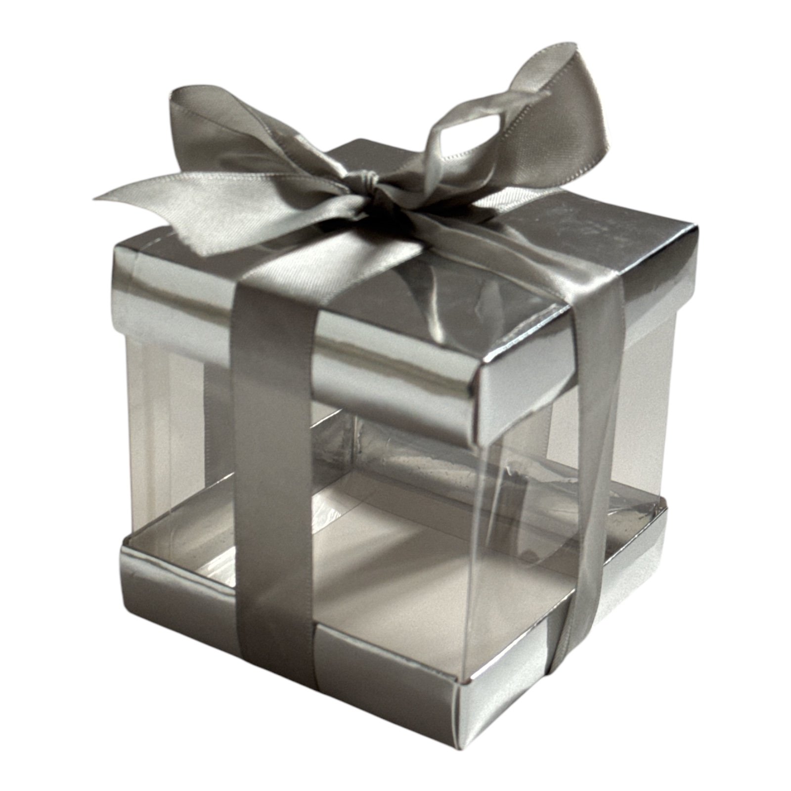 Adaugă un plus de eleganță cadourilor tale cu aceste cutii transparente, decorate cu accente luxoase în argintiu, auriu și roșu. Perfecte pentru orice ocazie specială, aceste cutii oferă un design modern și sofisticat, cu o structură transparentă care pune în valoare conținutul. Fiecare cutie este completată cu o fundă asortată pentru un aspect festiv și rafinat. Ideale pentru cadouri precum accesorii, dulciuri sau alte obiecte de mici dimensiuni, pot fi utilizate pentru activități promoționale, pachete cadou cu produse cosmetice sau naturiste. Disponibile în trei variante elegante: argintiu, roșu și auriu. Cutiile din acetofan lucios și rezistent cu formă de cub și baza din carton lucios cu panglică asortată se livrează la set de 12 bucăți. Baza și cutia din acetofan se livrează pliate, împreună cu panglica de culoare asortată.Baza din carton se asamblează mai ușor folosind un pistol cu silicon . Dimensiuni : 9 x 9 x 9cm