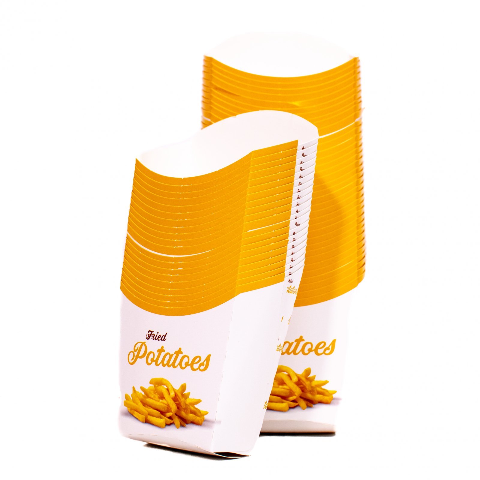Set 100 cutii carton de unica folosinta pentru livrarea sau servirea de cartofi prajiti in sistem delivery sau catering. ,œ Realizate din carton lucios , cerat, pentru protectie termica , cu imprimeu comercial Fried Potatoes Va recomandam ambalajul ideal pentru servirea cartofilor , cutii din carton pentru cartofi prajiti, ideale pentru food truck, locatii eatgo, terase pe plaja, fast-food-uri sau de ce nu, chiar pentru o petrecere reusita acasa! ,œ Incapatoare, perfecte pentru o portie medie (normala) de cartofi prajiti, cutiile au urmatoarele dimensiuni: 11.5cm partea lunga din spate si 7cm in fata, cu deschiderea 9x6cm. Alege din gama completa de ambalaje pentru livrare mancare: supe ciorbe, meniu si desert, pe toate le gasesti la Horeca Trading Distribution!