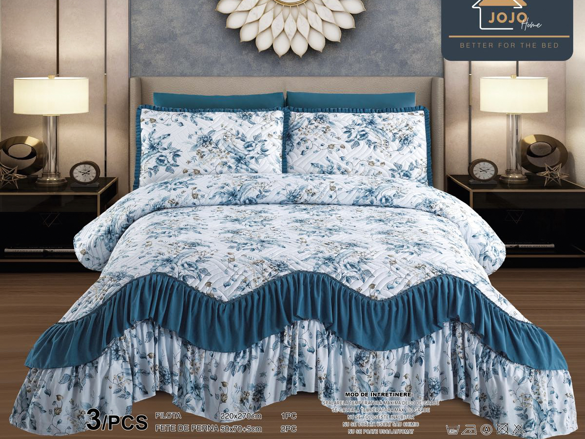 Cuvertura pat dublu, 3 piese, Bumbac Finet, 220x270cm, cu volanase, Jojo Home, Alb-Albastru, flori