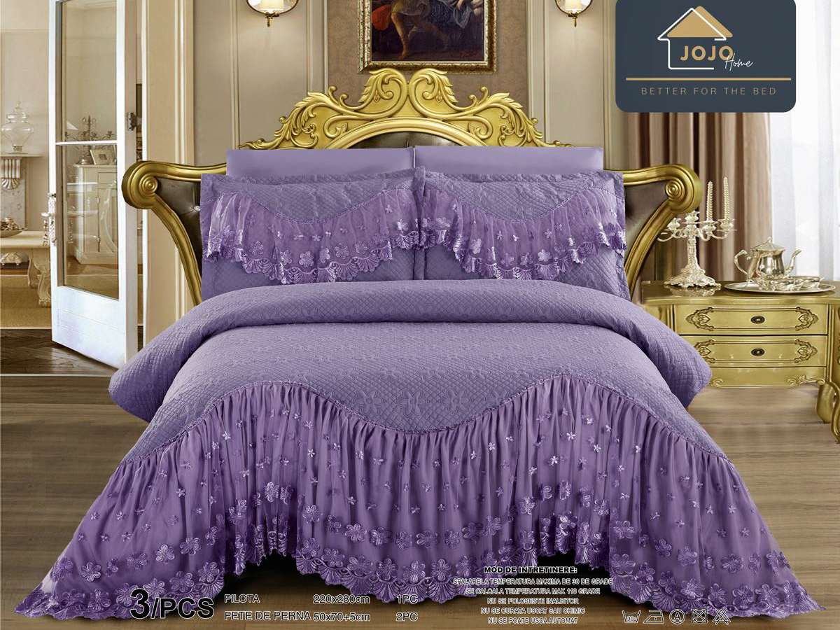 Cuvertura de lux, pentru pat 2 persoane, din bumbac tip finet, cu volanase din voal cu dantela brodata, pentru un plus de eleganta si rafinament. Cuverturile de pat sunt cele mai potrivite pentru anotimpul rece. Totodata, ele adauga mai multa caldura dormitorului tau. Cuvertura este matlasata ultrasonic. Setul vine ambalat in husa transparenta din plastic - poate fi folosita ca husa pentru depozitare sau ca ambalaj pentru a darui celor dragi aceasta minunata cuvertura. Avantajele cuve