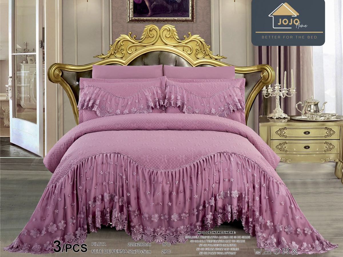 Cuvertura de lux, pentru pat 2 persoane, din bumbac tip finet, cu volanase din voal cu dantela brodata, pentru un plus de eleganta si rafinament. Cuverturile de pat sunt cele mai potrivite pentru anotimpul rece. Totodata, ele adauga mai multa caldura dormitorului tau. Cuvertura este matlasata ultrasonic. Setul vine ambalat in husa transparenta din plastic - poate fi folosita ca husa pentru depozitare sau ca ambalaj pentru a darui celor dragi aceasta minunata cuvertura. Avantajele cuve