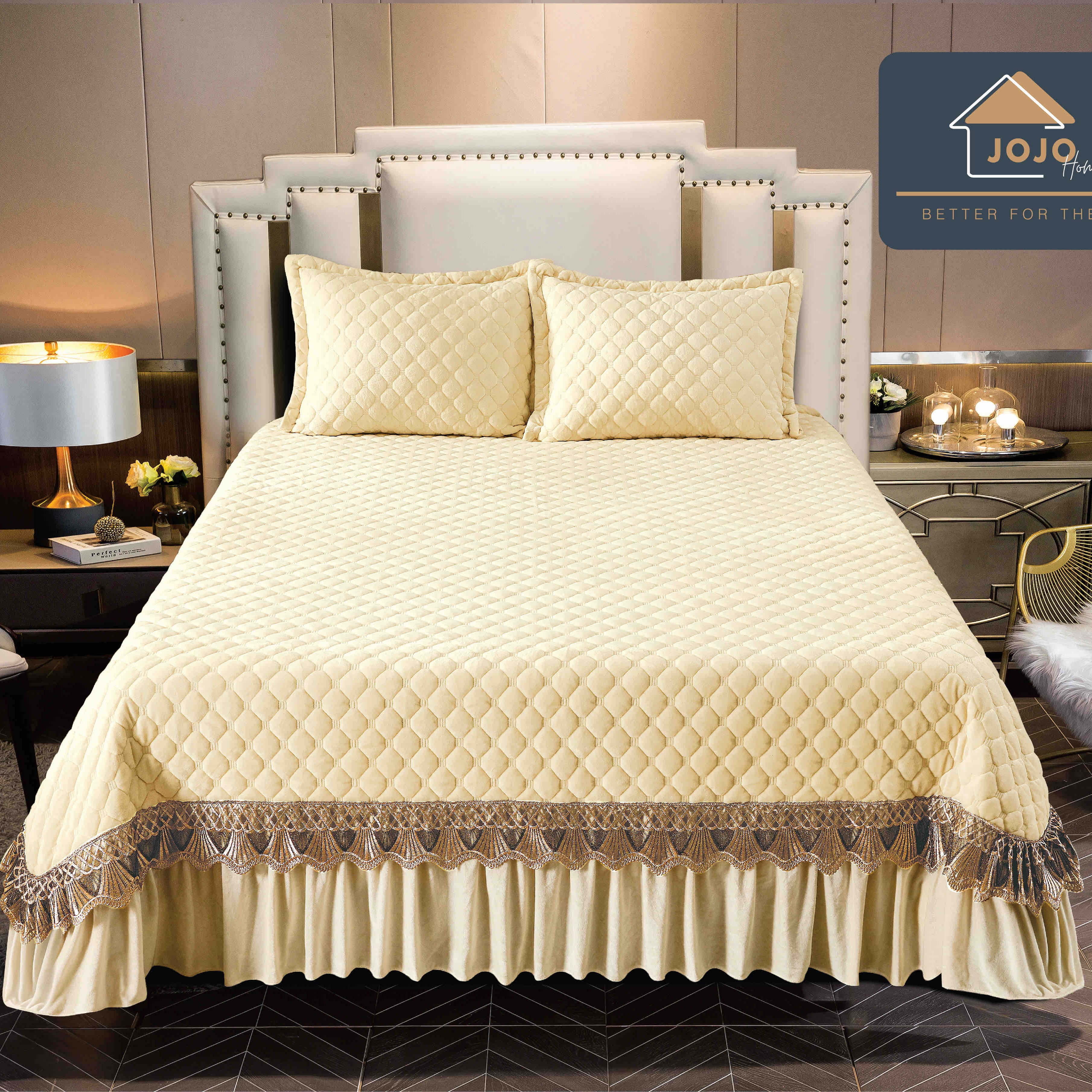 Cuvertura de lux, pentru pat 2 persoane, din catifea, matlasata, cu volanase pe partea de jos, accesorizate cu o eleganta broderie aurier, pentru un plus de eleganta si rafinament. Cuverturile de pat sunt cele mai potrivite pentru anotimpul rece.  Totodata, ele adauga mai multa caldura dormitorului tau. Setul vine ambalat in husa transparenta din plastic - poate fi folosita ca husa pentru depozitare sau ca ambalaj pentru a darui celor dragi aceasta minunata cuvertura. Avantajele cuvert