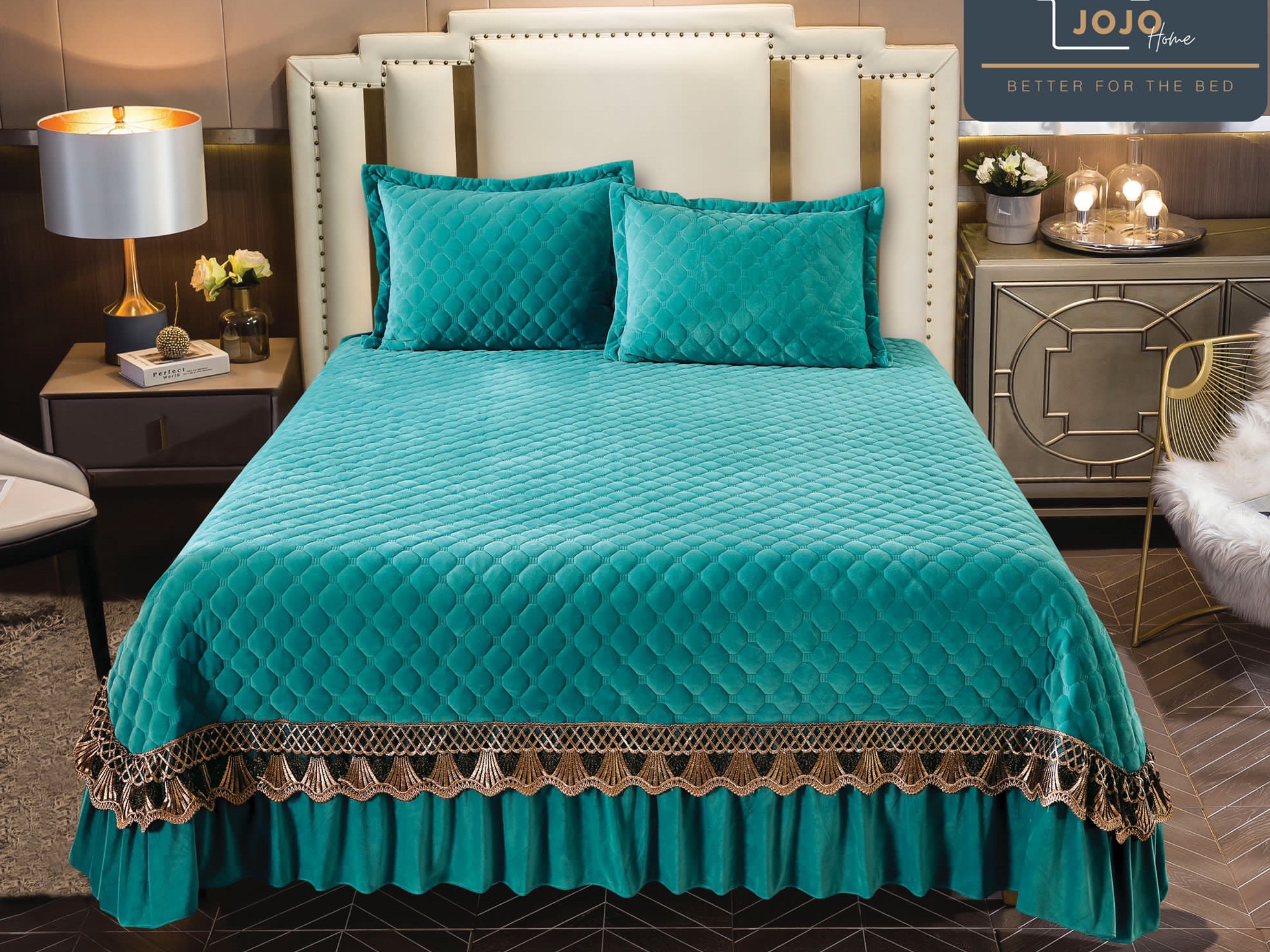 Cuvertura pat dublu, 3 piese, Catifea Matlasata cu Broderie Aurie, 250x270cm, Jojo Home, Turquoise