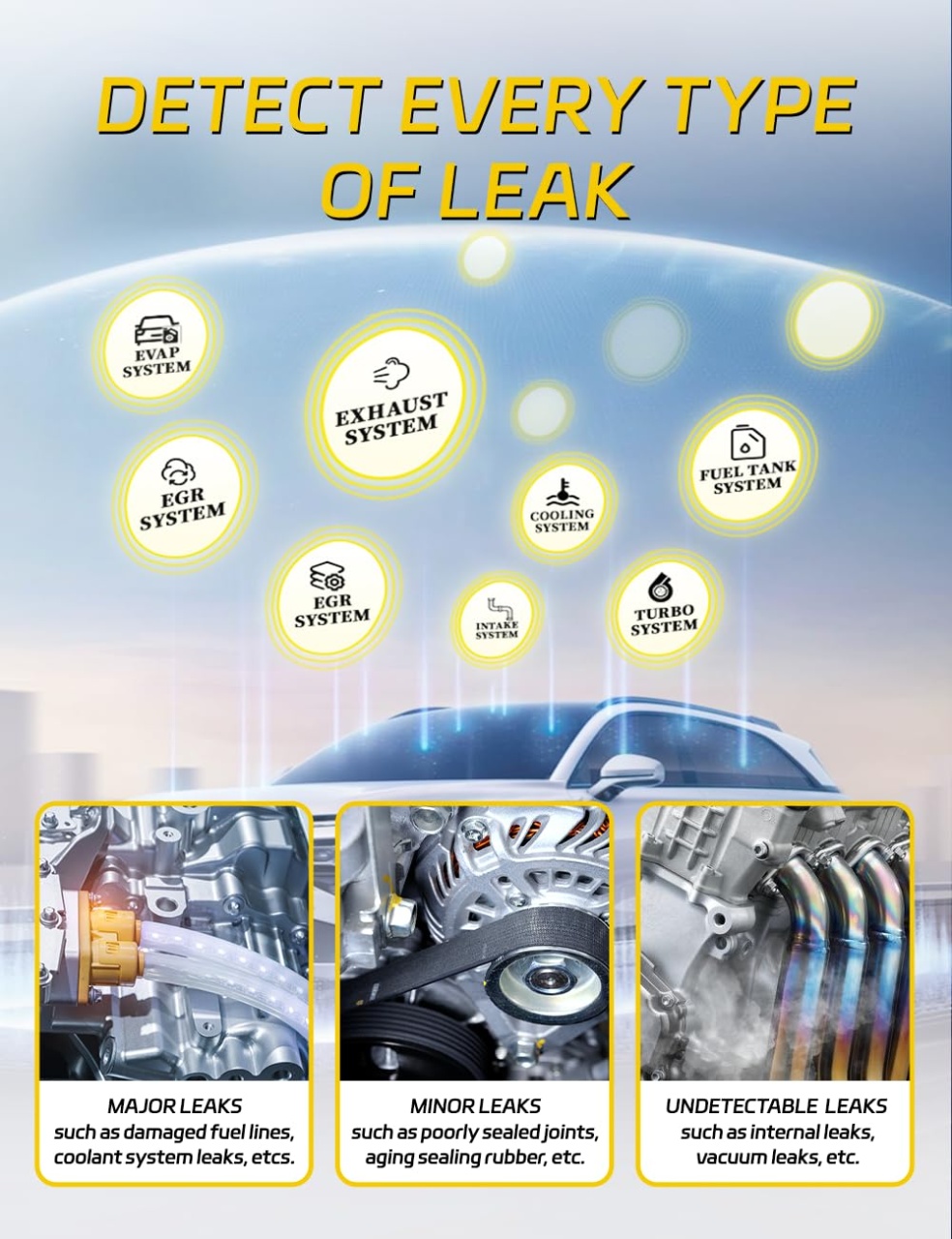 Solary SD302 – Masina de Fum Auto EVAP 12V pentru Detectare Scapari Vacuum si Conducte Solary SD302 este un dispozitiv profesional de testare cu fum, proiectat special pentru detectarea scaparilor din sistemele auto. Este ideal pentru mecanici, ateliere auto si pasionati de intretinerea masinii, permitand identificarea rapida si precisa a celor mai mici pierderi de aer sau vapori. Caracteristici principale: ✔️ Testare universala pentru multiple sisteme auto: Compatibil cu testarea sistemului EVAP , sistemului de admisie , sistemului de evacuare , rezervorului de combustibil , etanseitatii motorului , si altor conducte auto. Poate fi utilizat la autoturisme, motociclete, SUV-uri, camioane si chiar ambarcatiuni. ✔️ Mod dual: Aer & Fum Mod aer: Verifica rapid daca exista o scapare de presiune. Mod fum: Emitere de fum dens in doar 10-20 secunde pentru localizarea exacta a scaparii. ✔️ Echipat cu manometru integrat: Afisajul presiunii permite monitorizarea in timp real a testului , ajutand la identificarea scaparilor: Presiunea creste constant ➜ sistem etans. Presiunea scade ➜ exista o scurgere. ✔️ Pompa de aer incorporata: Nu necesita compresor extern – produsul este gata de utilizare imediat dupa alimentarea la 12V. ✔️ Protectie inteligenta la supraincalzire: Daca lichidul este insuficient sau apar conditii de suprasolicitare, functia de protectie automata opreste emisia de fum si reporneste cand temperatura revine in limite normale. ✔️ Design portabil si greutate redusa: Cantareste doar 2.8 kg , usor de depozitat si transportat in orice atelier sau portbagaj. ✅ Utilizare recomandata pentru: Detectarea scurgerilor EVAP Verificarea etanseitatii sistemului de admisie sau evacuare Intretinerea preventiva a autovehiculelor Testarea garniturilor, furtunurilor si imbinarii conductelor ? Pachetul include: Masina de fum Solary SD302 Set conectori si furtune de test Recipient pentru lichid special (e-liquid) ⚠️ Compatibilitate: Tensiune alimentare: DC 12V Compatibil cu majoritatea vehiculelor OBD2 si non-OBD2 Potrivit atat pentru uz personal, cat si profesional (service-uri auto) ℹ️ Nota: Pentru utilizare corecta, se recomanda folosirea lichidului de test compatibil cu acest model. Nu folositi uleiuri inflamabile sau solutii neomologate. ?️ Utilizare Conecteaza dispozitivul la o sursa DC 12V . Umple rezervorul cu lichid de test compatibil. Selecteaza modul de lucru: Aer sau Fum . Conecteaza furtunul la sistemul testat (ex. EVAP, admisie etc.). Monitorizeaza presiunea si urmareste aparitia fumului pentru localizarea scaparii. Dupa test, opreste aparatul si goleste lichidul ramas daca nu mai este folosit. Suport tehnic si garantie Echipa Solary ofera suport prompt si solutii rapide in cazul oricaror probleme aparute in utilizare.