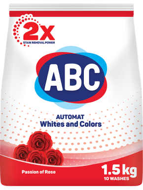 Detergent de Rufe ABC, Automat, Pudră, En-Gros - 1.5 Kg, Passion of Rose Whites & Colors Acest detergent de rufe ABC, sub formă de pudră, cu formula sa Whites and Colors și parfum de Passion of Rose, este un produs ideal pentru achiziții en-gros de către supermarketuri, magazine alimentare, distribuitori de produse de curățenie, hoteluri, pensiuni și alte instituții care necesită soluții eficiente de spălare a rufelor. Cu o putere dublă de îndepărtare a petelor, asigură o curățare profundă și un parfum îmbătător atât pentru rufele albe, cât și pentru cele colorate. Detalii Produs: Brand: ABCTip Produs: Detergent de rufe sub formă de pudră.Utilizare: Automat (pentru mașini de spălat automate).Cantitate: 1.5 Kg.Număr de Spălări: Suficient pentru 10 spălări.Formula Specială: Whites and Colors - conceput pentru a curăța eficient atât rufele albe, cât și pe cele colorate.Parfum: Passion of Rose - oferă rufelor un miros intens și plăcut de trandafir.Putere de Curățare: 2x Stain Removal Power - indică o putere dublă de îndepărtare a petelor.Ambalaj: Sac / pungă sigilată, cu un design atractiv în nuanțe de roșu și alb, ilustrând trandafiri roșii și elemente grafice care subliniază prospețimea și performanța.