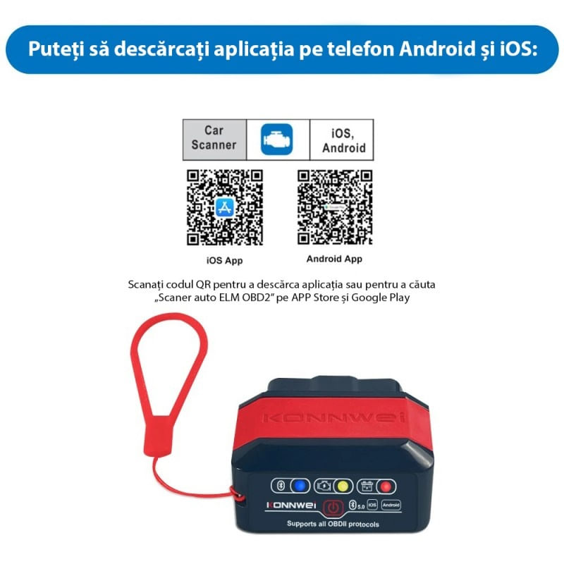 Adaptorul KONNWEI OBD II de la Techstar® este un instrument puternic de diagnosticare auto dezvoltat1: Este compatibil cu specificatiile complete OBD II/EOBD. Diverse moduri de conectare fara fir pentru a va conecta smartphone-ul sau pad-ul.2: Citeste datele în timp real ale motorului masinii, cum ar fi turatia motorului, timpul de aprindere, reglarea combustibilului, temperatura apei, consumul de combustibil.3: Accepta o varietate de aplicatii OBD II.Adpatorul KONNWEI OBD II este un scaner OBDII Bluetooth 5.0 auto de înalta calitate.Caracteristici:1. LUMINA DE VERIFICARE A MOTORULUI - Acest cititor de cod iCar Pro va va ajuta sa economisiti bani si sa diagnosticati cu precizie problema luminii de verificare a motorului. Foarte usor de folosit.2. MONTAREA USORA - Majoritatea masinilor fabricate în ultimele 2 decenii sunt echipate cu un port de diagnosticare OBD2, pur si simplu gasiti portul si conectati iCar Pro.3. FITI SI UITA - Este într-adevar posibil sa te potrivesti si sa uiti, deoarece are dimensiunile micro si functionalitatea unica de economisire a energiei care îti protejeaza bateria4. FUNCTIONEAZA CU SUTE DE APLICATII - Dispozitivul KONNWEI Pro Bluetooth Low Energy functioneaza cu cele mai populare aplicatii OBD. Va rugam sa gasiti instructiuni de descarcare pentru dispozitivul Android în descrierea produsului.Functii:Cititi codurile de diagnosticare a erorilor, atât generice, cât si specifice producatorului, si afisati semnificatia acestora. (peste 3000 de definitii de cod generic în baza de date).Stergeti codurile de eroare si dezactivati indicatorul luminos MIL („Verificati motorul”)RPM motorValoarea de încarcare calculataTemperatura agentului de racireStarea sistemului de alimentare cu combustibilViteza vehicululuiTrim de combustibil pe termen scurtTrim pentru combustibil pe termen lungPresiunea galeriei de admisieTiming AdvanceTemperatura aerului de admisieDebitul de aerPozitia absoluta a acceleratieiTensiuni ale senzorului de oxigen/ajustari de combustibil pe termen scurt asociateStarea sistemului de alimentare cu combustibilPresiunea combustibiluluiSfaturi înainte de cumparare:Pentru ca vehiculul dumneavoastra sa fie compatibil cu OBD II, acesta trebuie sa aiba un DLC cu 16 pini (Data LinkConector) sub bord si informatiile privind controlul emisiilor vehicululuiEticheta trebuie sa mentioneze ca vehiculul este compatibil OBD II. Pentru a va asigura ca vehiculul dvs. respecta OBD-II, cautati un autocolant pe vehiculsub capota din compartimentul motor pe care scrie clar „conform OBD II sau certificat”.Protocoale OBD-II acceptate:SAE J1850 PWM (41,6 Kbaud)SAE J1850 VPW (10,4 Kbaud)ISO9141-2 (5 baud init, 10,4 Kbaud)ISO14230-4 KWP (5 baud init, 10,4 Kbaud)ISO14230-4 KWP (initializare rapida, 10,4 Kbaud)ISO15765-4 CAN (ID de 11 biti, 500 Kbaud)ISO15765-4 CAN (ID 29 biti, 500 Kbaud)ISO15765-4 CAN (ID de 11 biti, 250 Kbaud)ISO15765-4 CAN (ID 29 biti, 250 Kbaud)SAE J1939 CAN (ID 29 biti, 250* Kbaud)Acoperire vehicul:Functioneaza pe toate vehiculele OBD2 (din 1996 în sus în SUA) si vehiculele EOBD (benzinamasini din 2001 si masini diesel din 2003/2004 în Europa)Cum sa configurati împerecherea Bluetooth:Versiune cu mod dublu BLE 5.0Pentru utilizatorii de Android:Ecranul de startAccesati pagina de setariSelectati V-LINK Parola implicita este „1234”Dispozitiv asociatRulati aplicatia TorqueAccesati setarea adaptorului OBD II al aplicatiei TorqueAlegeti tipul de conexiune>BluetoothAlegeti dispozitiv Bluetooth>V-LINKIesiti complet din aplicatia TorqueRulati aplicatia TorqueConectatPentru utilizatorii iOS:Ecranul de startAccesati pagina de setariFaceti clic pe functia Bluetooth(Numele dispozitivului este invizibil)Rulati aplicatia AccurateAccesati pagina de setari precise a aplicatieiSelectati Bluetooth si conectati-vaIesiti din aplicatia Accurate si rulati din nouConectatSpecificatii:Tensiune de alimentare: 11,5 V—15 VCurent de alimentare: <200MaCurent de asteptare: <30Ma (TONWON Pro =<3Ma)Temperatura de functionare: -40℃--85℃Umiditate de functionare: 5%--95%RH fara cadere de roua.
