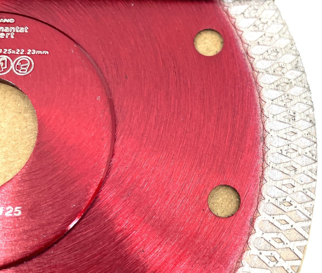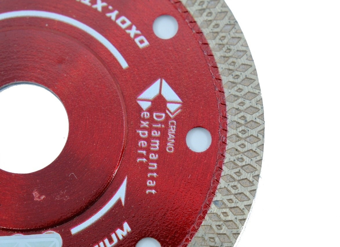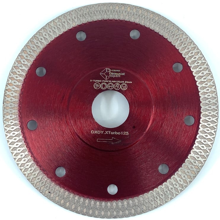 Disc DiamantatExpert pt. Portelan dur & Gresie ft. dura 125x22.2 (mm) Premium - DXDY.XTURBO.125 Calitate : Premium - grad de calitate - durata de exploatare foarte buna. Pentru : gresie portelanata foarte dura, placi ceramice, placi. Taiere : uscata sau cu apa Utilizare cu : polizor unghiular Descriere : Segment continuu cu un design nou combinat cu diamantarea de calitate superioara garanteaza o taiere precisa, curata si fina. Asigura o taiere foarte rapida si o durata buna de viata chiar si cand este folosit la materiale foarte dure precum gresia portelanata. Excelent pentru suprafete delicate, asigura o taiere fara aschiere. Cu corp metalic ranforsat pentru minimul de vibratii. Durata de viata: Foarte Buna 4/6 Viteza de taiere: Extrem de buna 4.5/6 Finetea taierii: Taiere foarte fina, muchii curate 4.5/6 Diametru disc ext. x int.: 125 x 22,2 mm. Inaltime segment: 10mm. Grosime segment: 1,3 mm.