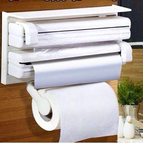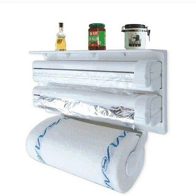 Dispenser triplu de bucatarie pentru hartie, folie aluminiu si folie stretch realizat din material plastic tip ABS design simplu economie de spatiu se poate fixa foarte usor pe diverse suprafete (frigider, mobilier de bucatarie, etc.) convenabil, rapid, practic spatii pentru folie de aluminiu si folie stretch suport pentru prosoape de hartie (rola de bucatarie) dimensiuni (fara suportul pentru prosoape de hartie): lungime 37,5 cm X inaltime 18 cm X latime 7 cm