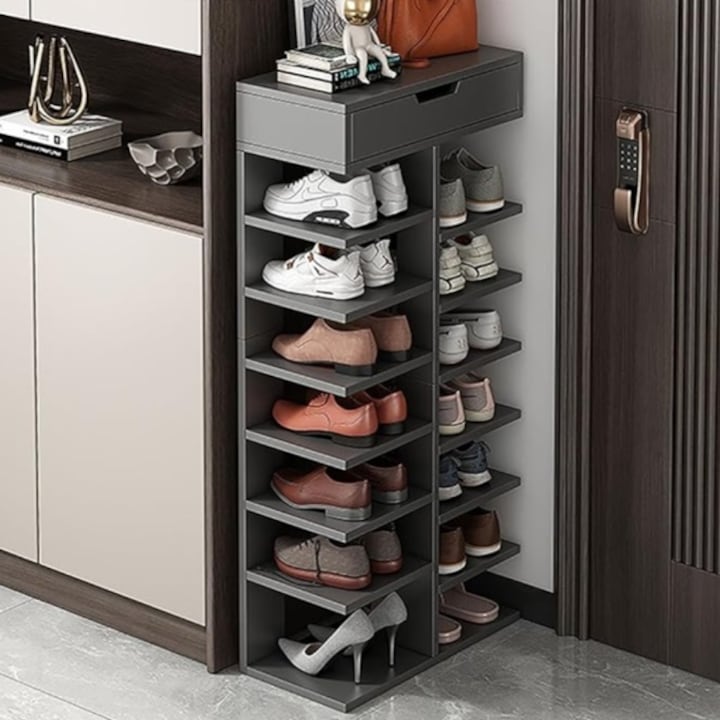 Suport pantofi din lemn, culoare cires Raft cu 7 etaje, 13 polite, inaltime 110 cm Descoperiti un element esential pentru organizarea si afisarea colectiei dvs. de pantofi cu acest elegant si practic raft de depozitare a pantofilor. Cu o inaltime de 110 cm, acest pantofar ofera 8 niveluri generoase de depozitare, pe care puteti aseza pana la 13 perechi de pantofi intr-un mod ordonat si accesibil. Construit din lemn MDF de inalta calitate, acest raft de pantofi ofera o solutie durabila si atractiva pentru organizarea pantofilor dvs. Fiecare nivel, fiecare polita, si fiecare etajare a fost proiectata cu grija pentru a se potrivi cu toate tipurile de incaltaminte, de la pantofii eleganti pana la pantofii sport. Acest raft de pantofi cu 7 niveluri este o solutie de depozitare compacta si functionala, perfecta pentru a economisi spatiu in dormitor, hol sau oricare alta zona a casei. Cu finisajul sau elegant si design-ul sau modern, se va potrivi cu usurinta in orice decor. Fiind o alegere versatila pentru depozitarea pantofilor, acest produs ofera un spatiu organizat si usor de gestionat pentru colectia dvs. de incaltaminte. Cu acest raft de pantofi, va veti bucura de acces rapid si usor la pantofii preferati, fara a sacrifica stilul si aspectul estetic. In concluzie, acest raft de pantofi cu 7 niveluri din lemn MDF cu 13 polite este solutia ideala pentru a-ti organiza si afisa colectia de pantofi intr-un mod sofisticat si practic. Adauga un plus de eleganta si eficienta in organizarea pantofilor tai cu acest raft de pantofi de calitate superioara. Caracterisitici: 7 etaje 13 polite Lemn MDF 22 cm - adancime 45 cm - latime 97 cm - inaltime Greutate: 5 kg