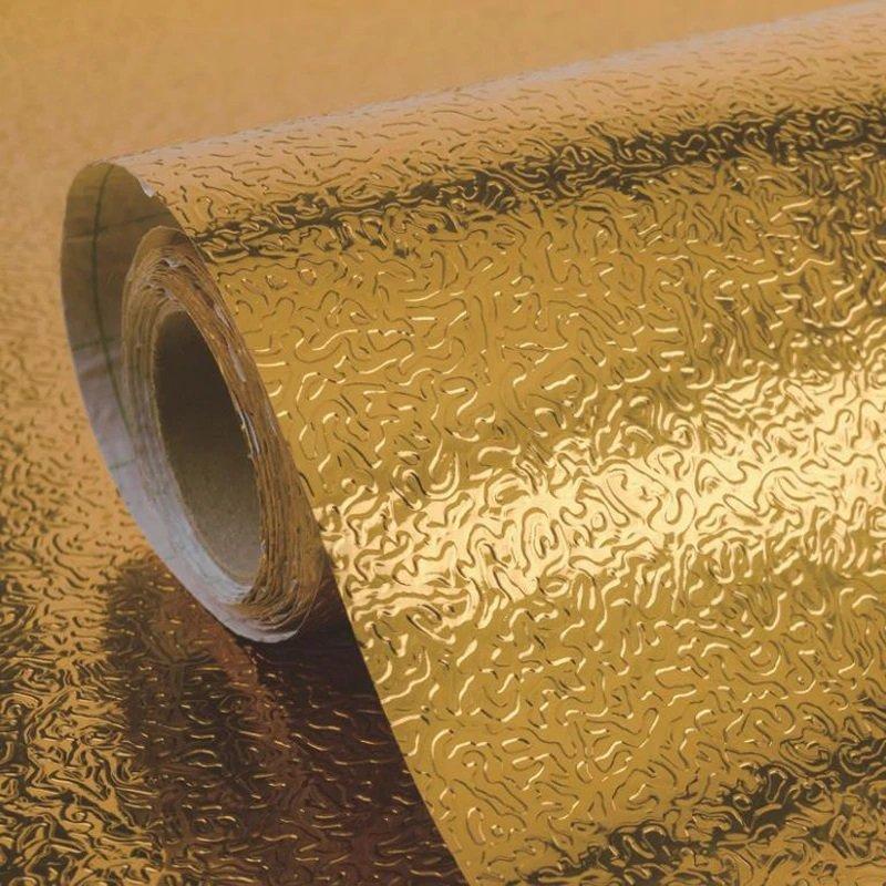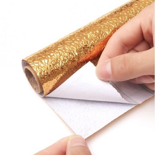 Folie adeziva de aluminiu, 60 x 300 cm, Auriu Folie de aluminiu rezistenta la temperatura ridicata, impermeabila si rezistenta la ulei. Folie autocolanta - sticker din gama consumabilelor pentru bucatarie. design atractiv din aluminiu. intretinere usoara - se spala rapid nu retine apa si uleiul rezistenta la temperatura ridicata dimensiuni: 60 x 300 cm Continut pachet: 1x Folie aluminiu autocolanta bucatarie Atentie! Folia nu este rezistenta la flacara deschisa, nu se aplica pe suprafata aragazului. Aceasta se aplica in spatele aragazului, direct pe faianta, perete sau pe blatul de lucru. Autocolant mobila confectionat din folie PVC este o solutie accesibila pentru a schimba rapid, cu un buget redus aspectul pieselor de mobilier. Puteti reconditiona dulapuri, usi, mese, rafturi, blaturi din bucatarie, baie, balcon. Este rezistent la apa si umiditate - suprafata se poate curata usor cu o laveta umezita. Daca suprafata colata este foarte expusa la apa, pentru o mai buna rezistenta a autocolantului in timp, recomandam sigilarea marginilor cu un strat subtire de silicon transparent. Este rezistent la temperaturi de pana la 70 grade celsius. Acest aspect, face din autocolant o solutie optima pentru blatul din bucatarie sau masa. Autocolantul se poate lipi pe orice suprafata neteda: lemn/furnir, plastic, metal, plexiglass, sticla, oglinda, ceramica/faianta sau perete. Folia autocolanta poate fi utilizata si pentru realizarea produselor handmade, crafting sau decoratiuni interioare.