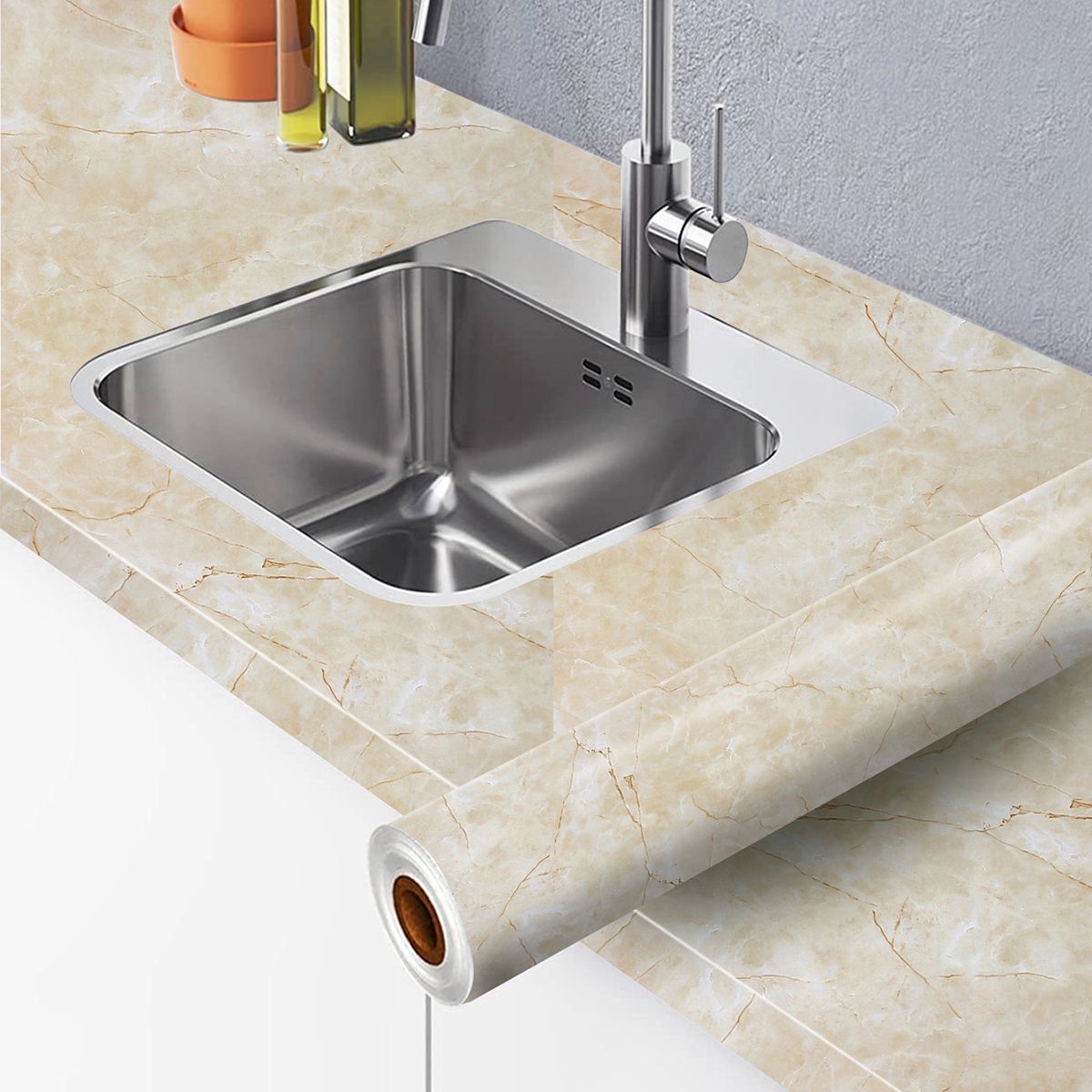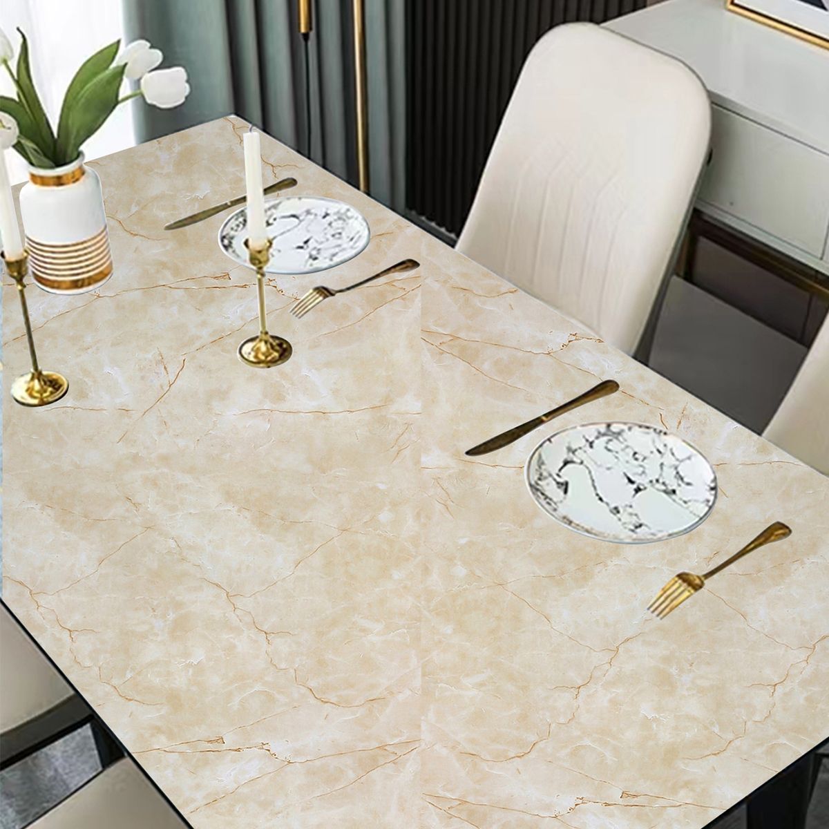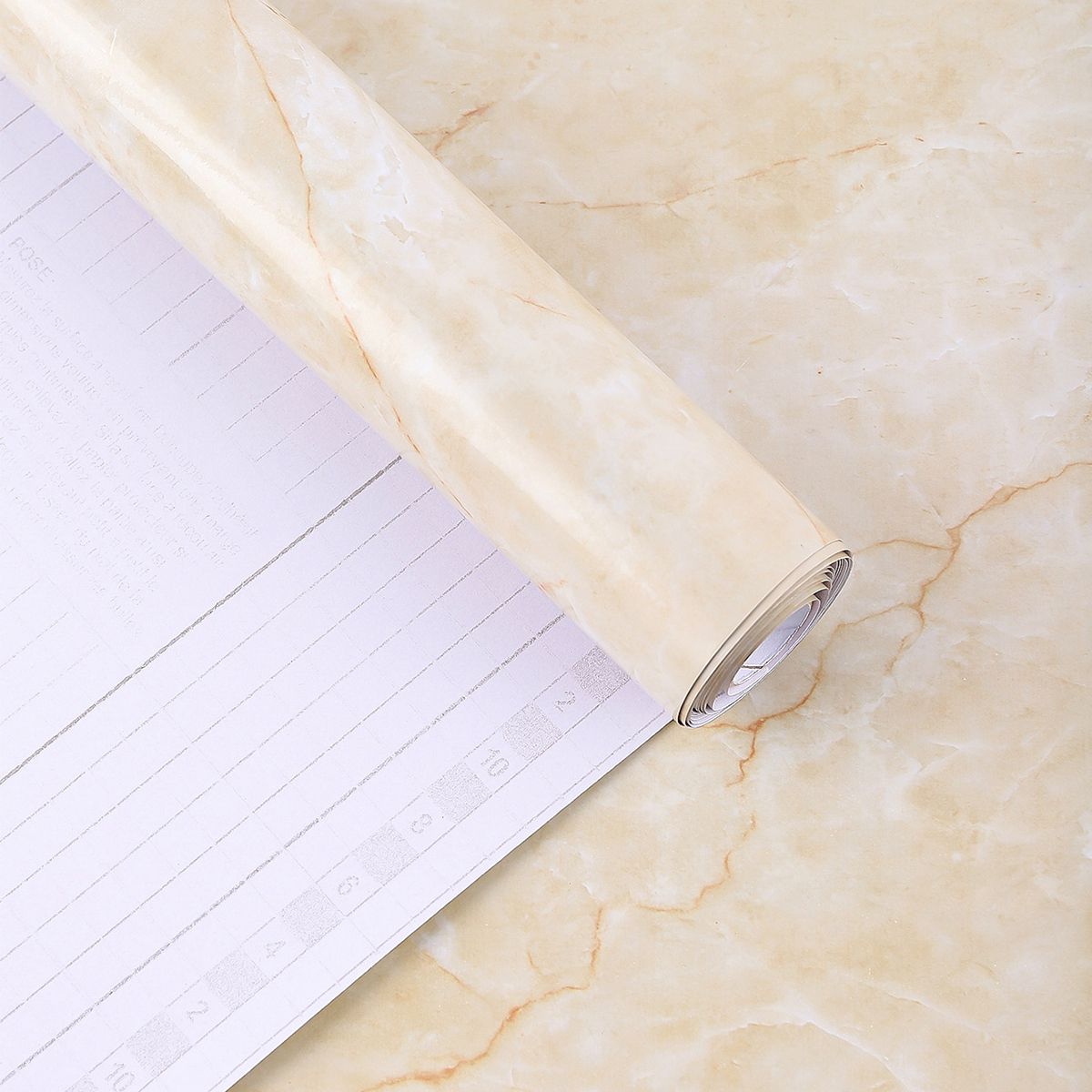 Folie adeziva imitatie marmura crem, 60 x 200 cm Folia autocolanta se monteaza pe orice suprafata neteda: mobila, usi, dulapuri, piese mici de mobilier, etc. Necesare pentru montaj: rigla, foarfeca, racleta, creion. Suprafata pe care veti aplica folia autocolanta trebuie sa fie curata, plata, fara denivelari. Masurati suprafata pe care doriti sa aplicati folia autocolanta, lasand suficient spatiu pentru marginea suprafetei. Taiati folia autocolanta la dimensiunea masurata. Dezlipiti o mica parte de la capatul foliei de autocolant de stratul suport. Luati folia autocolanta si cu miscari incete lipiti pe suprafata dorita de la capatul dezlipit de stratul suport. Cu racleta treceti usor peste folia autocolanta dinspre interior catre exterior pentru a uniformiza si a nu se forma goluri de aer. Lasati sa se usuce 24 ore. Pentru suprafetele curbate puteti folosi feonul la temperatura medie. Este foarte rezistenta la zgarieturi si usor de curatat, se curata cu laveta si solutii specifice curatarii mobilierului. Dimensiune: 60 cm x 200 cm Autocolant mobila confectionat din folie PVC este o solutie accesibila pentru a schimba rapid, cu un buget redus aspectul pieselor de mobilier. Puteti reconditiona dulapuri, usi, mese, rafturi, blaturi din bucatarie, baie, balcon. Este rezistent la apa si umiditate - suprafata se poate curata usor cu o laveta umezita. Daca suprafata colata este foarte expusa la apa, pentru o mai buna rezistenta a autocolantului in timp, recomandam sigilarea marginilor cu un strat subtire de silicon transparent. Este rezistent la temperaturi de pana la 70 grade celsius. Acest aspect, face din autocolant o solutie optima pentru blatul din bucatarie sau masa. Autocolantul se poate lipi pe orice suprafata neteda: lemn/furnir, plastic, metal, plexiglass, sticla, oglinda, ceramica/faianta sau perete. Folia autocolanta poate fi utilizata si pentru realizarea produselor handmade, crafting sau decoratiuni interioare.