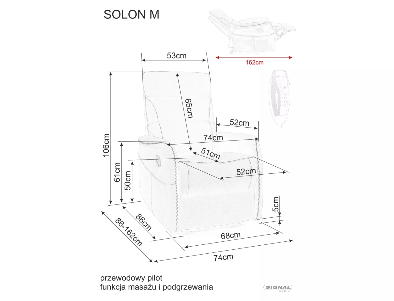 Fotoliul Solon M combină confortul suprem cu tehnologia modernă, oferind o experiență relaxantă și elegantă. Tapițat cu material bej, acest fotoliu este nu doar plăcut la atingere, ci și sofisticat în design, potrivit pentru livinguri contemporane sau spații de relaxare moderne. Dimensiuni fotoliu: A - 106, B - 74, C - 50, D - 51, E - 86÷162, F - 5 cm Detalii tehnice: Fotoliu rabatabil cu funcție de masaj și încălzire, material textil Brego 22, cadru: metal, culoare: bej deschis / negru. Buzunar practic pe partea dreaptă, telecomandă cu fir pentru funcția de masaj. Produsul nu este montat, este destinat pentru auto-asamblare. Instrucțiunile de montaj vin în colet.