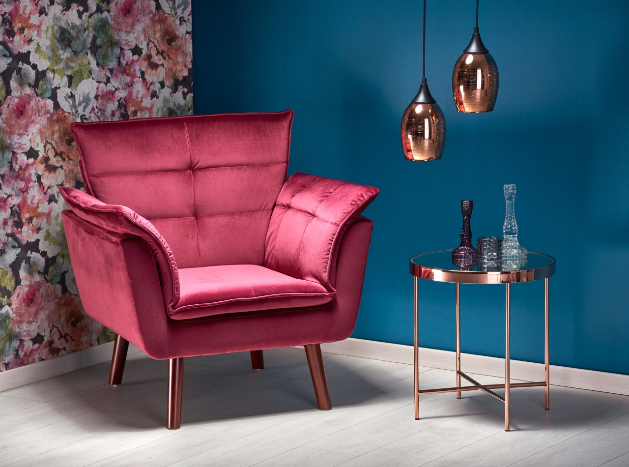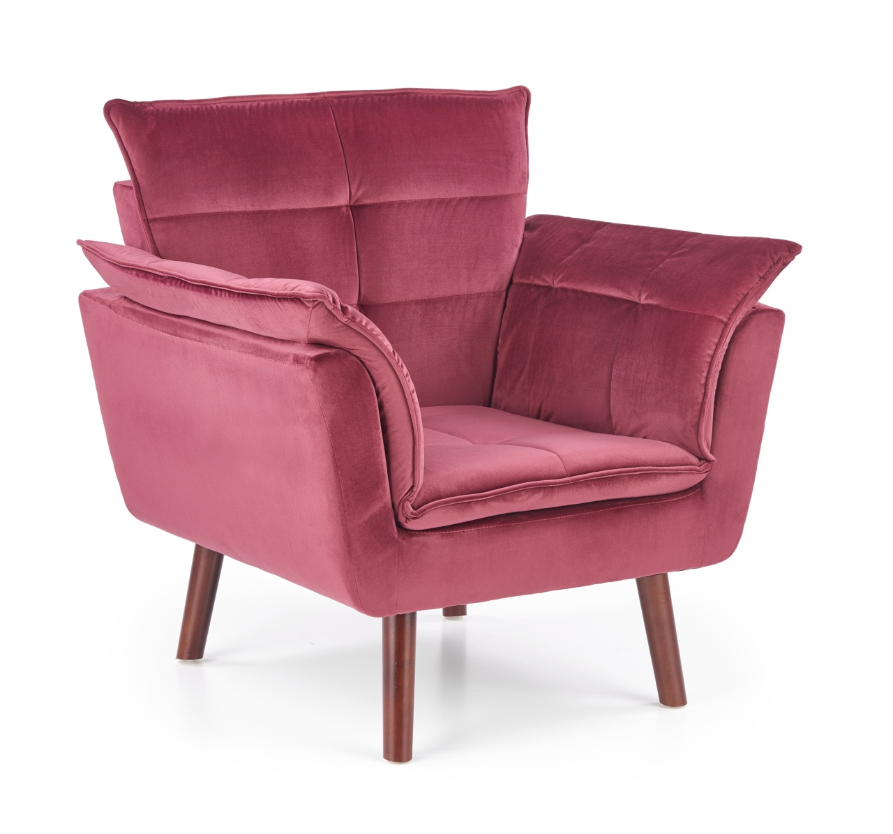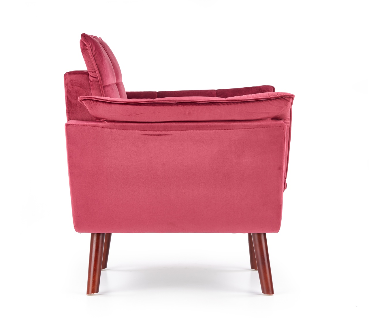 Fotoliu tapitat Rezzo burgundy Fotoliul Rezzo este realizat din lemn masiv de cauciuc, in stil modern, confortabil si rezistent, cu design elegant si tapitat cu catifea de inalta calitate. Ideal pentru camera de zi, dormitor, cafenele, birouri. Dimensiuni: 80 73 84 44 Produsul nu este montat, este destinat pentru auto-asamblare. Instructiunile de montaj vin in colet.