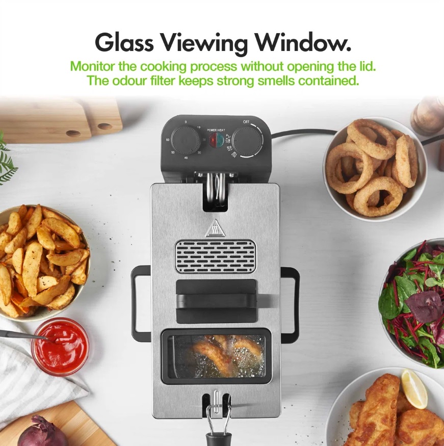 Friteuza electrica din inox, 3 litri, 2000 W, termostat ajustabil, capac transparent Friteuza electrica 3L, 2000W, Inox Transforma gatitul intr-o experienta rapida si delicioasa! Cu o capacitate de 3 litri si o putere impresionanta de 2000W, acest aparat este perfect pentru prepararea unor portii generoase de cartofi prajiti, aripioare crocante, peste pane sau deserturi precum gogosile — ideale pentru intreaga familie. Recomandata pentru: cartofi prajiti, nuggets, aripioare, peste pane, chiftele, legume tempura, gogosi si multe alte preparate delicioase! Caracteristici principale: Putere de 2000W – pentru prajire rapida, eficienta si uniforma Capacitate mare – 3 litri, perfecta pentru uz casnic si mese in familie Constructie robusta din inox (Edelstahl) – durabila, moderna si usor de curatat Cos de prajire detasabil cu maner ergonomic – pentru o manipulare sigura si practica Capac cu fereastra transparenta si filtru integrat – monitorizezi usor preparatele, fara stropi Termostat reglabil – controlezi cu precizie temperatura de gatire, pentru rezultate perfecte de fiecare data Specificatii tehnice: Tensiune: 220–240V ~ 50/60Hz Putere: 2000W Capacitate: 3 litri Greutate aproximativa: 2–3 kg (ambalata)