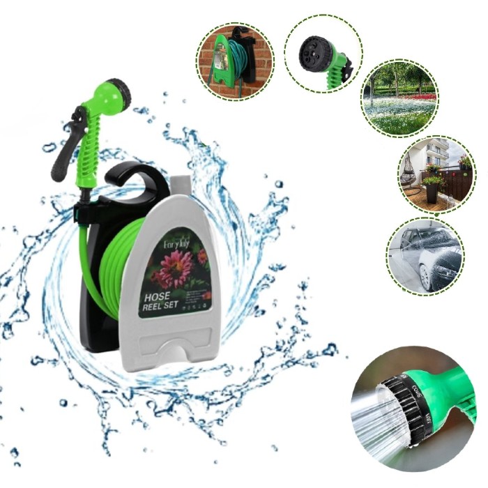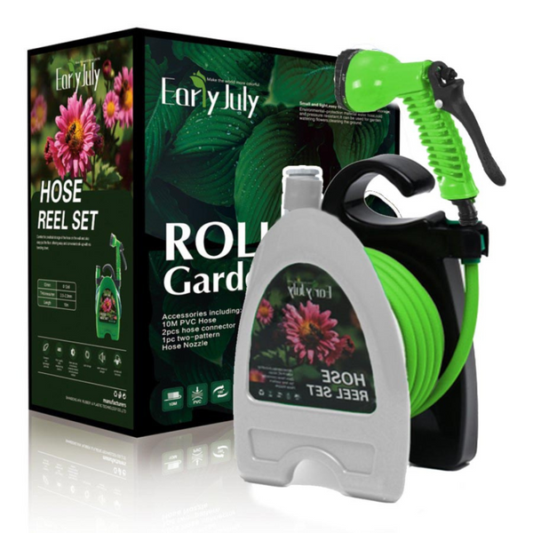 Furtun cu Tambur/Rola, 10 Metri, Conectori Furtun din material flexibil Dupa folosire se strange in carcasa Flexibil, poate fi rulat rapid Compact, se potriveste intr-un spatiu mic Presiunea apei reglabila Maneta de sprijin pe capul de pulverizare Prindere antialunecare Dimensiune conector: 1/2 Culoare furtun: verde Material furtun: Tesatura 7 moduri de pulverizare Lungime: 10 metri Grosime: 2,3 mm Continut pachet: Furtun de irigare 2 conectori rapidi 2 adaptoare pentru robinet de gradina Garnitura de cauciuc Tambur transportator