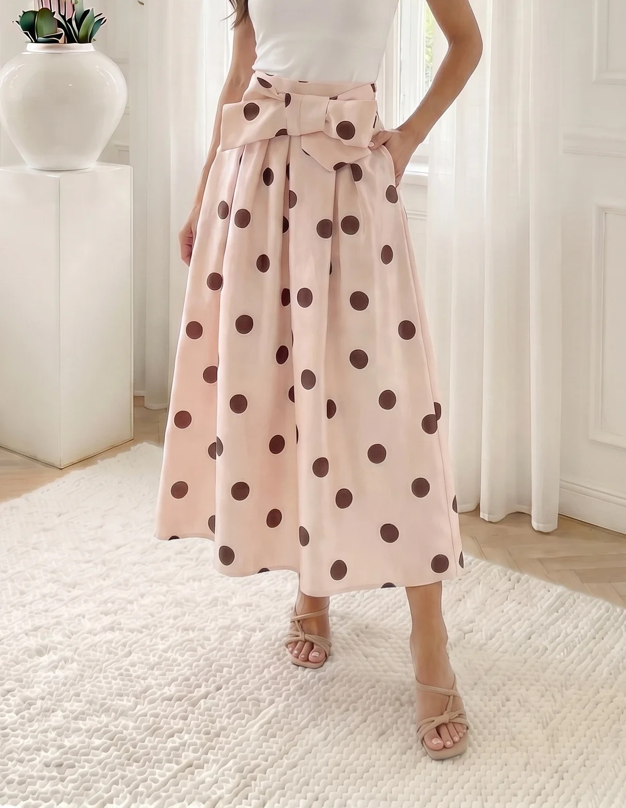 Fusta midi crem cu buline si funda in talie, alegerea perfecta pentru un look feminin si retro-chic. Piesa se remarca prin volumul spectaculos si imprimeul jucaus cu buline maro pe un fundal roz delicat. Talia inalta este evidentiata de o funda generoasa,
