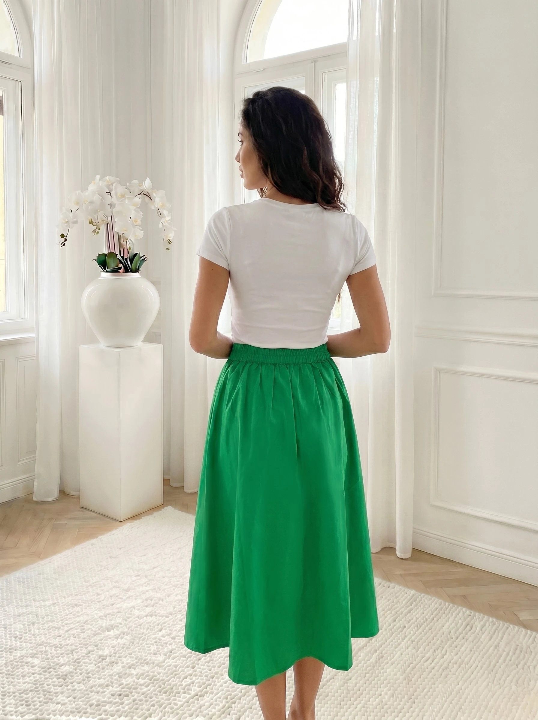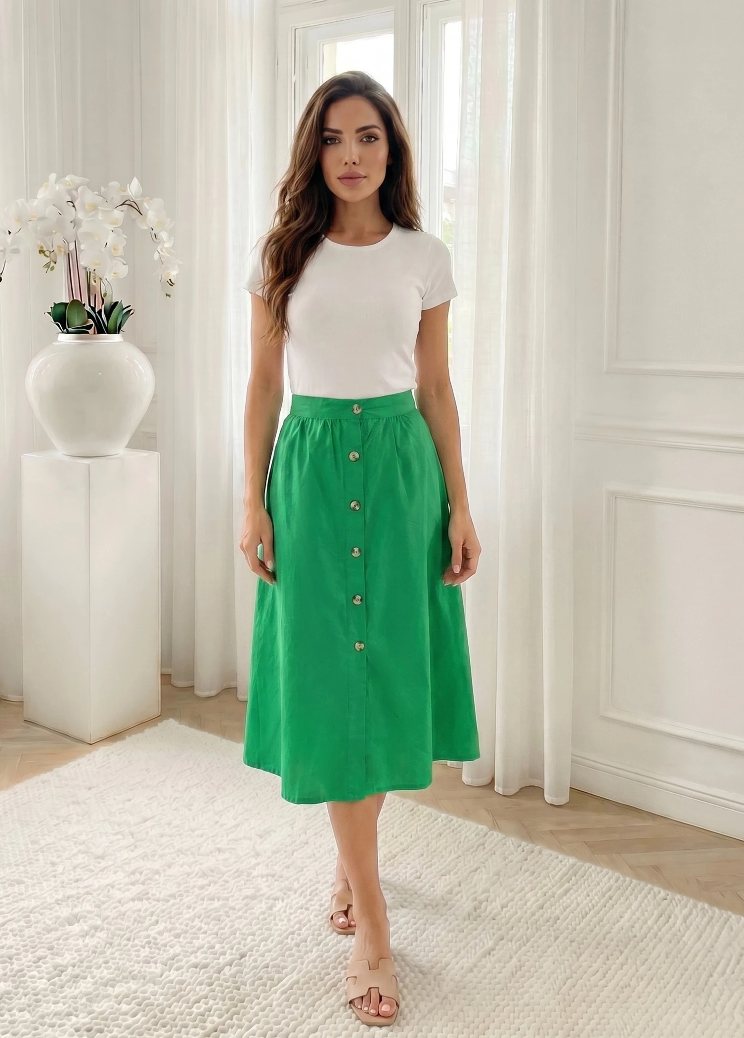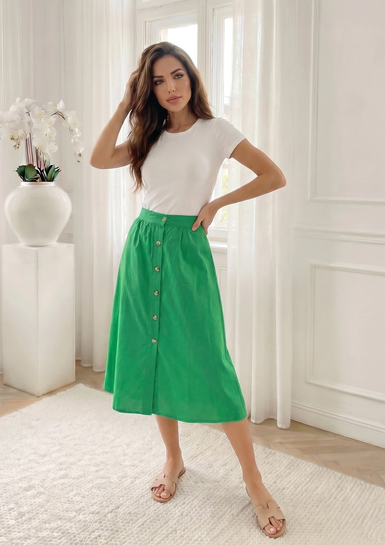 Fusta midi verde din bumbac organic cu nasturi frontali, piesa ideala pentru un look fresh si sustenabil in zilele insorite. Materialul natural si prietenos cu pielea este completat de o talie elastica in spate, garantand o potrivire confortabila si relax