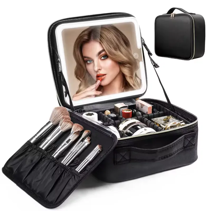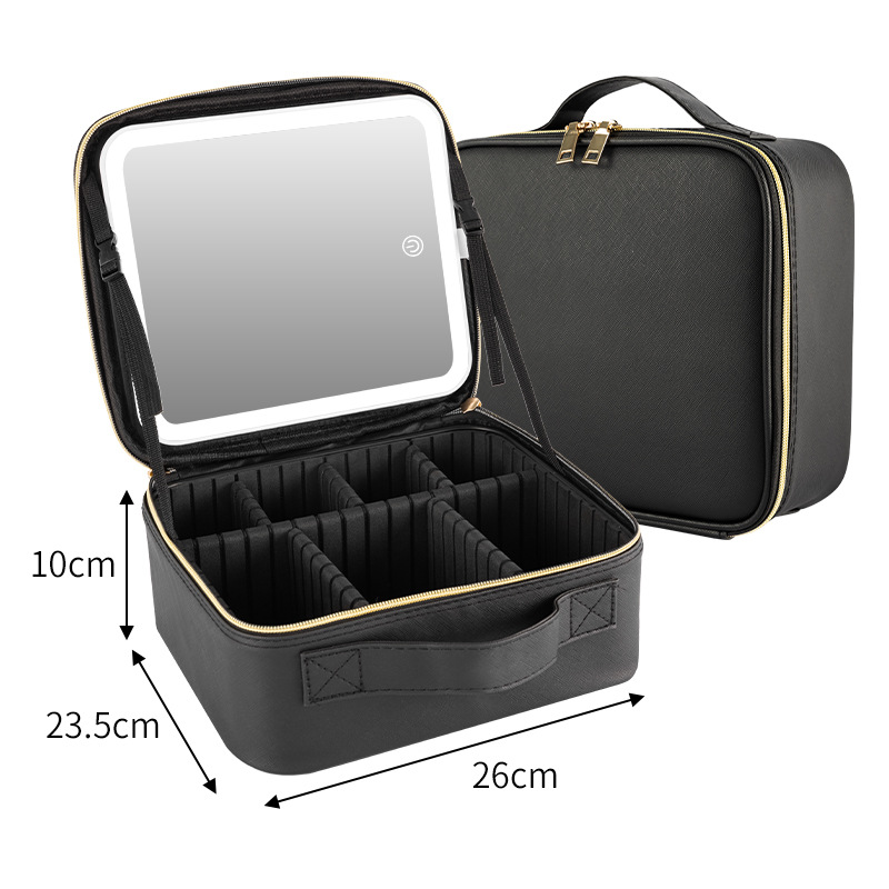 Geanta cosmetice cu oglinda si lumina LED realizata din piele ecologica oglinda integrata lumina LED incarcare USB (cablul este inclus) 7 compartimente pentru depozitare si organizare cosmetice portpensule cu 10 compartimente si protectie transparenta buton tactil ON/OFF baterie reincarcabila incoroprata maner fermoar metalic Lumina LED de 3 Nuante: Cu trei nuante diferite de lumina LED (rece, calda si naturala).