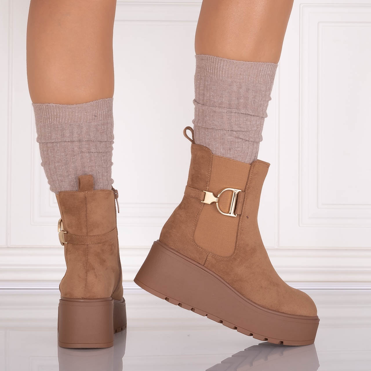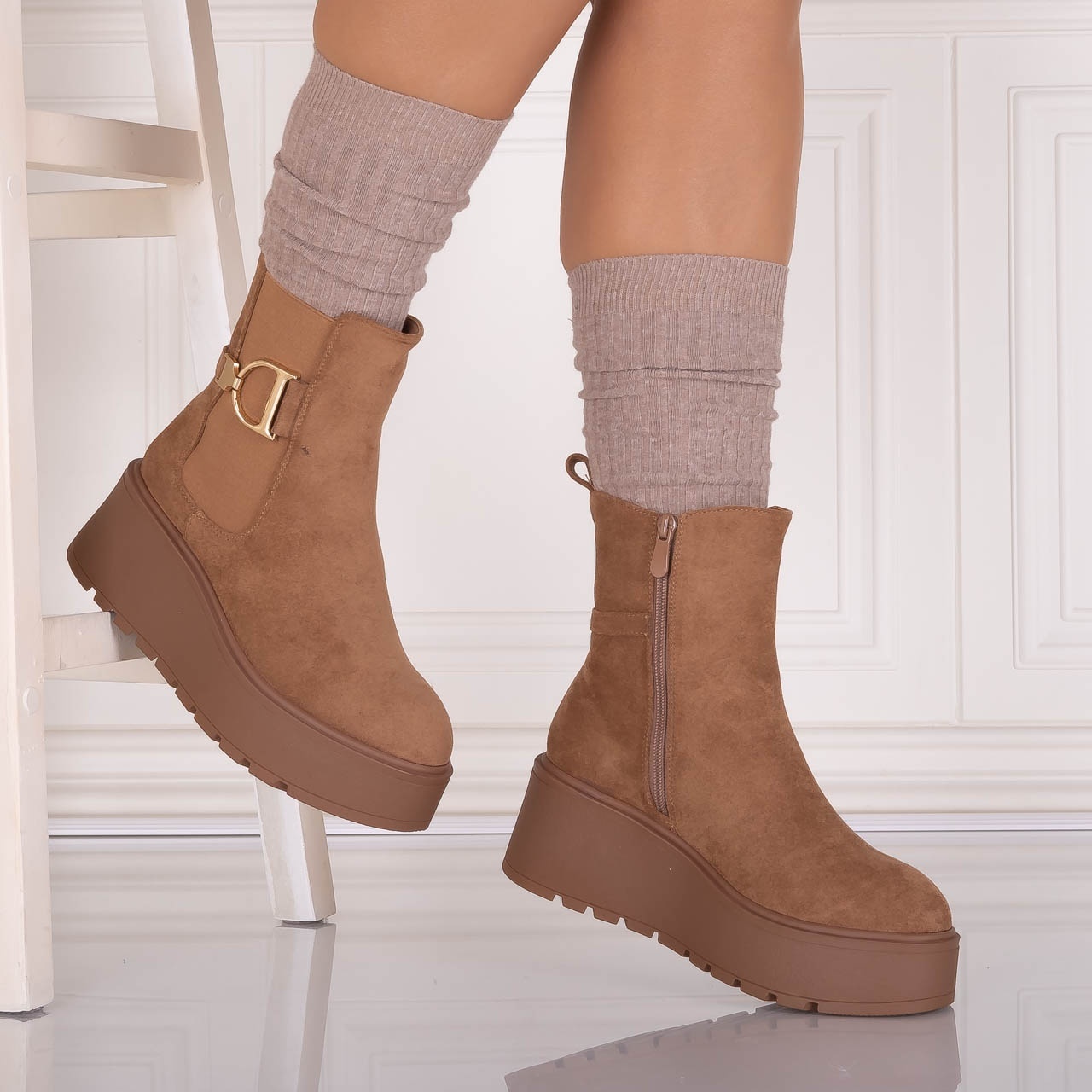 Ghete dama Camel din Piele Ecologica Intoarsa Anirta