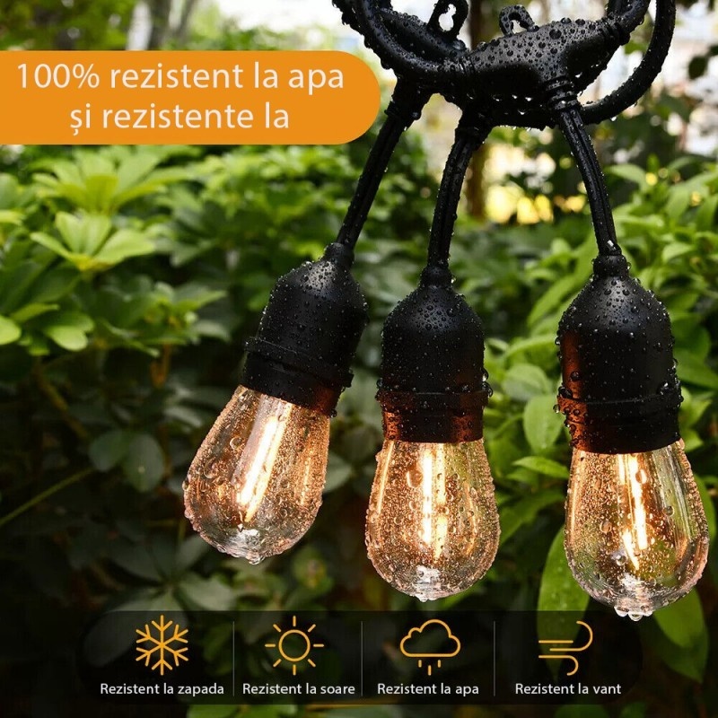 Iluminează-ți grădina cu stil cu aceste lumini de exterior alimentate de la rețea. Setul de 15 de becuri rotunde, în stil „para”, va adăuga o notă de clasă oricărui spațiu exterior. Lungimea de 10 m a ghirlandei facilitează alimentarea luminilor de la o priză. Puteți chiar conecta mai multe seturi în secvență pentru a acoperi o zonă mai mare. Caracteristici: Lungimea standard este de 10 m Ghirlanda luminoasa are 15 becuri transparente cu un LED in interior, fasung E27, din plastic, de exterior Becurile sunt asezate la o distanta de 65 cm Becurile sunt LED si detasabile Becurile din plastic sunt ultra rezistente la socuri si intemperii Becurile nu sunt dimabile Forma becurilor este para Dimensiunea becurilor este: 50 x 90 mm Fasungul becurilor este E26 Fiecare fasung este prevazut cu un manson de cauciuc care se muleaza perfect pe bec, astfel incat infiltrarea apei sa fie imposibila Culoarea becurilor este transparenta Lumina becurilor este foarte calda (2200k) Puterea unui bec LED este de 1 W, echivalentul unui bec incandescent de 10 W Chiar daca un bec lumineaza cat unul incandescent de 10 W, acesta consuma doar 1 W Puterea totala a ghirlandei luminoase de 10 m este de 24 W Cablul este de culoare neagra cu pendul, foarte rezistent, conectabil pana la 1000 W Cablul este cauciucat 2*1mm, masiv si rezistent la tractiune; recomandam dublarea acestuia cu un cablu metalic/sufa la deschideri mai mari de 10m Lungimea unui pendul este de 10 cm Tensiunea la care ghirlanda luminoasa functioneaza este de 220-240V Ghirlanda luminoasa poate fi folosita la exterior si interior - protectie IP65 Ghirlanda luminoasa poate fi folosita de la minus 30 grade pana la plus 50 grade (poate fi folosita in exterior pe toata durata anului) Ghirlanda luminoasa este conectabila; este prevazuta cu o mufa speciala, prin infiletare pot fi unite pana la 5 ghirlande luminoase pentru o lungime maxima de 75 m (maxim 120W) Astfel exista posibilitatea de a crea orice lungime necesara sau de a face permutari oricand si oriunde doriti Ghirlanda luminoasa poate fi folosita ca decoratiune de sarbatori, in casa sau in exteriorul ei, pe terasa sau in gradina si ca instalatie pentru Craciun.