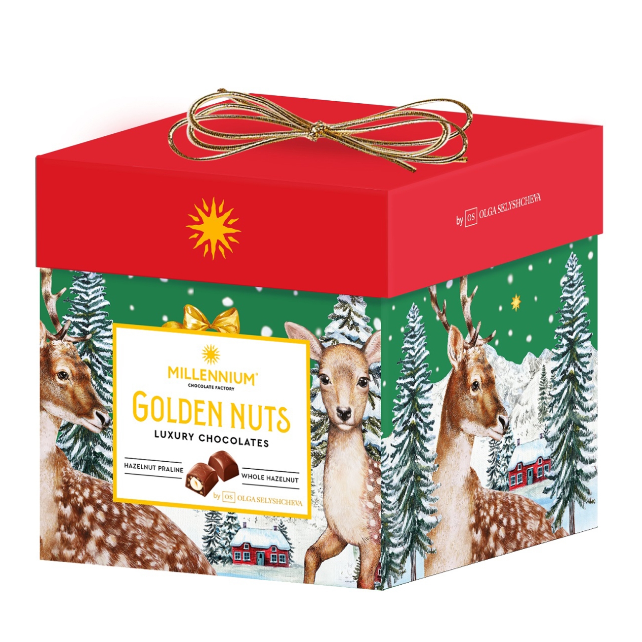 Acest produs este disponibil în mai multe modele. Acesta se vinde individual, iar livrarea se va realiza în mod aleator. Nu se poate alege un anumit model. Cutia Millennium Golden Nuts Luxury Chocolates este o alegere elegantă pentru un cadou de sărbătoare. În interior se află praline fine cu cremă de alune și miez crocant de alună întreagă, acoperite cu ciocolată catifelată. Ambalajul special, ilustrat de artista Olga Selyshcheva, surprinde scene de iarnă cu animale și peisaje de basm, completate de o fundă aurie care adaugă un plus de rafinament. Perfectă pentru a aduce bucurie și savoare în momentele festive.