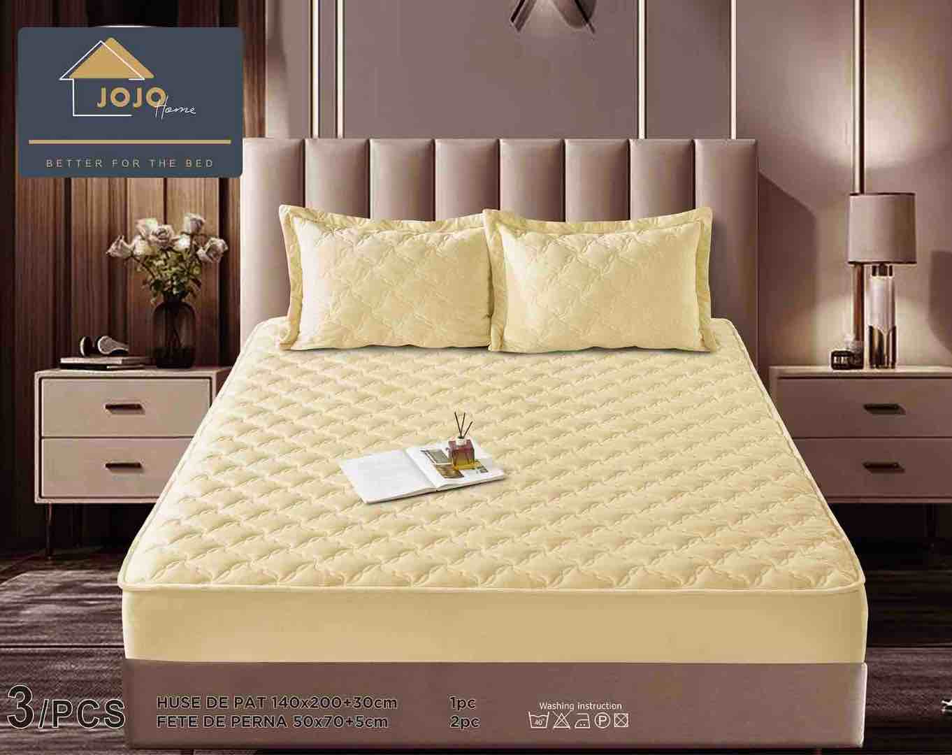 Husa Topper Matlasata din Catifea 140x200 cm + 2 Fete de Perna – Catifelare, Fixare Perfecta si Eleganta la Superlativ       Adauga un strat de rafinament si confort patului tau cu aceasta husa matlasata tip topper, realizata din catifea moale, placuta la atingere si completata de doua fete de perna asortate. Proiectata pentru saltele de 140x200 cm, husa ofera nu doar un plus de eleganta estetica, ci si protectie eficienta si sustinere delicata, pentru un somn profund si odihnitor.   D