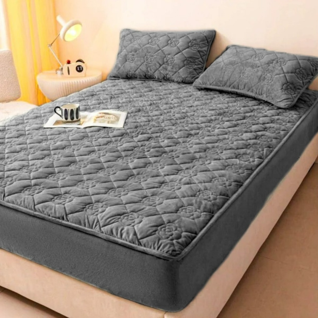 Husã matlasatã tip topper din catifea, 160x200cm + 2 fete de perna 50x70cm, gri inchis