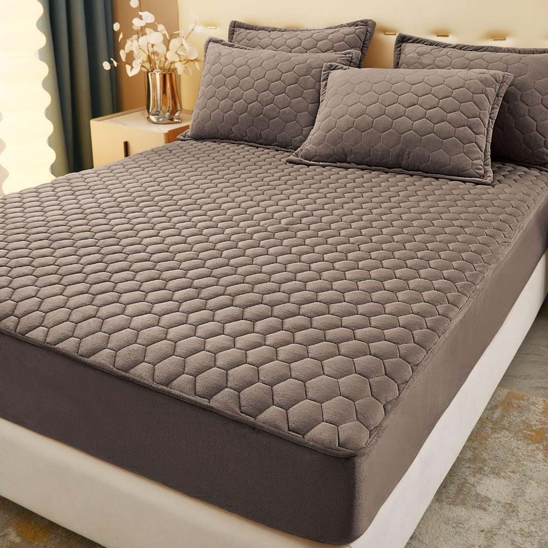 Husã matlasatã tip topper din catifea, 180x200cm + 2 fete de perna 50x70cm, maro inchis
