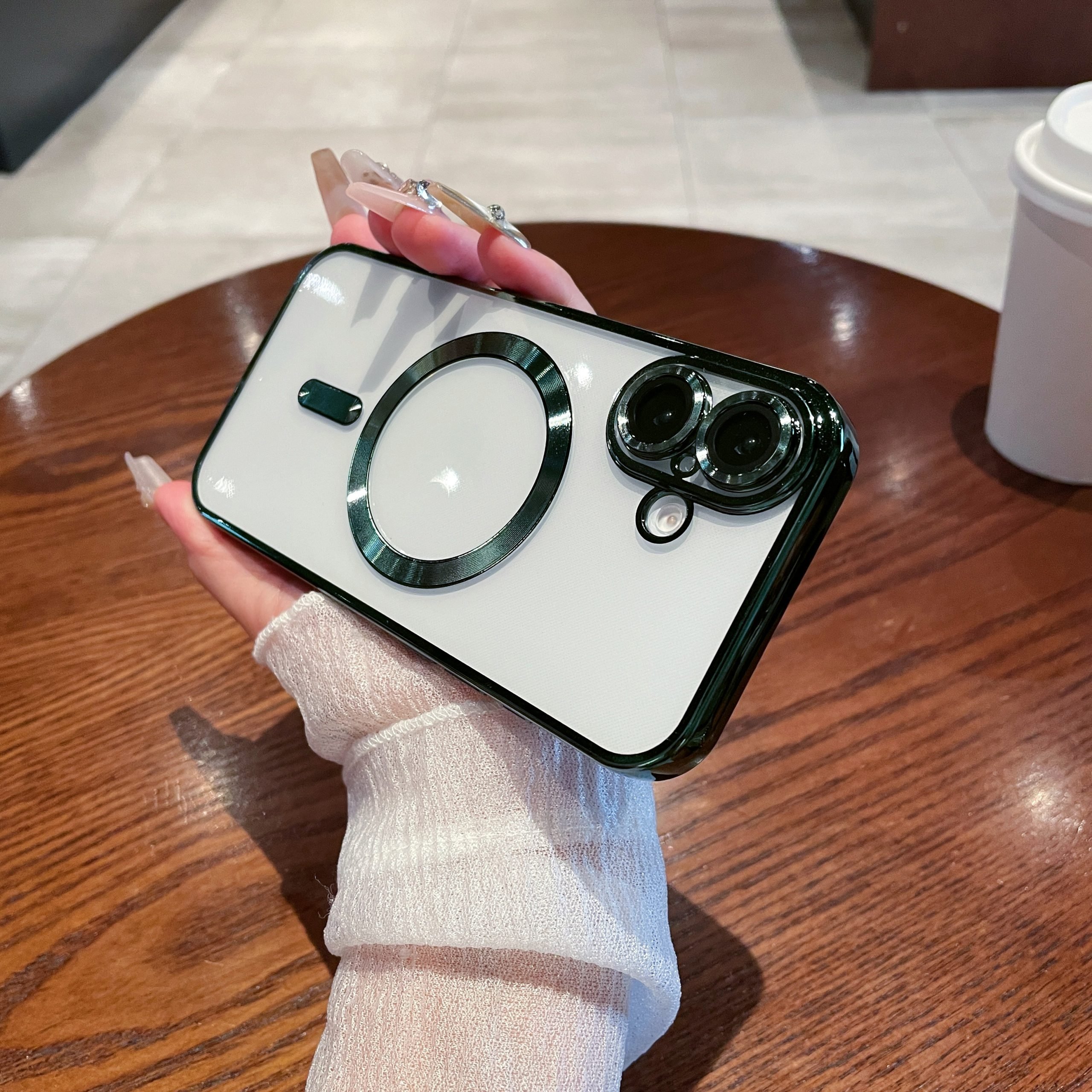 Husa pentru iPhone 16, Luxe Armor, Magsafe, Protectie camera, Silicon, Transparent, Verde Engros