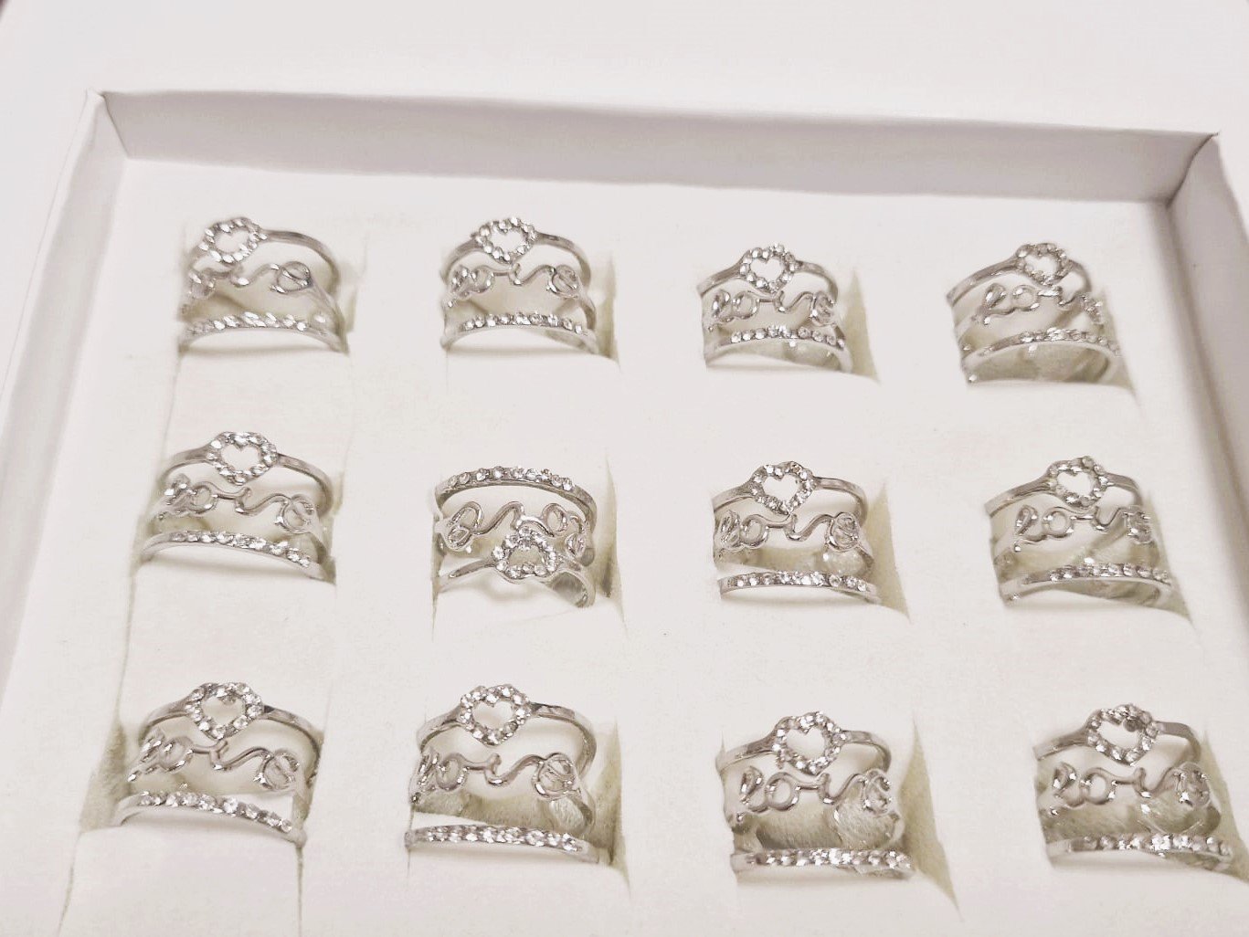 Inel din metal inoxidabil cu strasuri, model love, argintiu, linie discontinua.