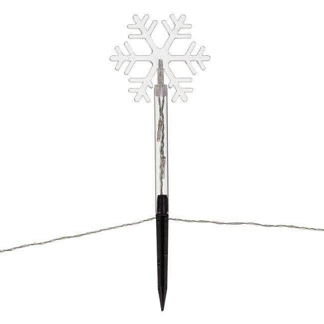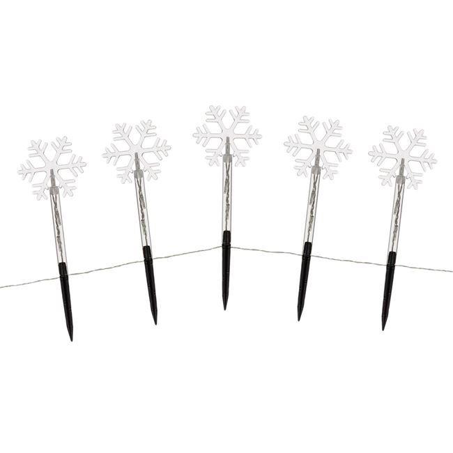Instalatie 5 fulgi decorativi pentru gradina Baterie decorativa de Craciun cu design de fulgi pe stick. Sunt asezate pe pamant ca felinare solare, locul de deasupra solului este de 24 cm, iar distanta dintre bete este de 35 cm. Cu functie de temporizare (6h Pornit / 18h Dezactivat). Functioneaza pe 3 baterii AA (nu sunt incluse). Dimensiunile - 12.5 x 6 x 38 cm Culoare LED - Alb cald Numar becuri - 15 Culoare cablu - transparent Lungime - 2.4 metri Pentru exterior (IP44)