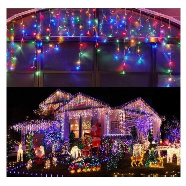 Instalatie de Craciun tip franjuri Ploaie de lumini cu Flash - lungime 10 metri Instalatiile sunt tip perdea luminoasa cu franjuri inegali si sunt interconectabile, putand fi prelungite. Instalatia de Craciun poate fi utilizata atat in spatii de interior cat si la exterior, protejata de intemperii aproximativ 250 led-uri dispuse pe fire cu lungimi diferite dispunerea ledurilor este secventiala franjurii sunt dispusi ciclic insiruirea repetandu-se alimentare 220 V ~ 50 Hz lungime instalatie: 10 metri se pot monta in serie ( pana la 4 instalatii) - prin intermediul adaptorului poate fi utilizata atat in spatii de interior cat si la exterior, protejata de intemperii Atentionari speciale: Indiferent de modelul achizitionat, instalatiile trebuie protejate de actiunea directa a ploii si a ninsorii (pericol de scurtcircuit, flama, topire a firului. Garantia nu acopera astfel de defectiuni daca produsele nu au fost ferite de apa. Conectarea la 220V se va face la o priza protejata de intemperii si de umezeala. Orice tip de conector va fi protejat de apa. A nu se lasa in functiune nesupravegheat ori la indemana copiilor! Nu interveniti asupra aparatului cand este conectat la priza. Atentie! Instalatia are o lungime de 10 metri franjuri + 1 metru cablu de alimentare.