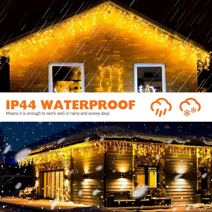 Instalatie franjuri, 300 LED, 12 metri, 8 jocuri de lumini, Alb cald