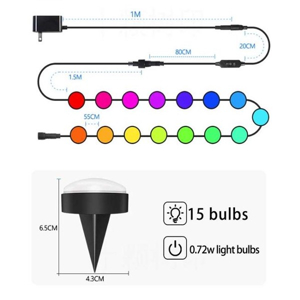 Kit iluminat gradina SMART LED IP67 15 becuri LED Telecomanda inclusa, control prin aplicatie Lumini smart cu aplicatie bluetooth adresabile Conexiune Bluetooth Putere 12 W, 900 LM 15 lumini diametru 46 mm Lumina RGB multicolor Lungime 9.4 metri + cablu de alimentare Unghi 120 grade Control prin aplicatie bluetooth sau prin controlerul de pe fir Alimentator inclus Tarusi de fixare pentru montaj pe sol Alimentare la priza 220 V Becuri interconectabile Lungime 9.4 ml Scanare cod QR - pe cutia produsului Se pot monta in gradina pe sol, pe pereti, mobilier etc. Diverse programe automate si evolutie in ritmul muzicii. Iluminati-va gradina cu acest kit de lumini LED pentru peisaj cu schimbare de culoare RGBIC, iluminare de gradina cu tensiune joasa, control inteligent Bluetooth, functionare a aplicatiilor mobile, control multiplu. Incorporat in diferite moduri dinamice si scena, 16 milioane de ajustari ale culorii luminii. Luminozitate, viteza reglabila, modul comutabil. Modulul DIY este disponibil, construieste-ti propria scena cu milioane de culori si optiuni multiple de efecte de iluminare. Modul de synchronizare muzicala, edit music with a built-in microphone. Setarea temporizatorului, setata somnul si trezirea. Acest kit de produse LED pentru lumini de gradina in aer liber contine 15 LED-uri, un controler si un adaptor de alimentare. Instalare: 1. Aliniati formele conectorului luminilor de gardini si ale tarusilor. 2. Fixati tarusul in lampa de gardina. 3. Introduceti lumina de gradina in pamant. 4. Conectati adaptorul de alimentare.