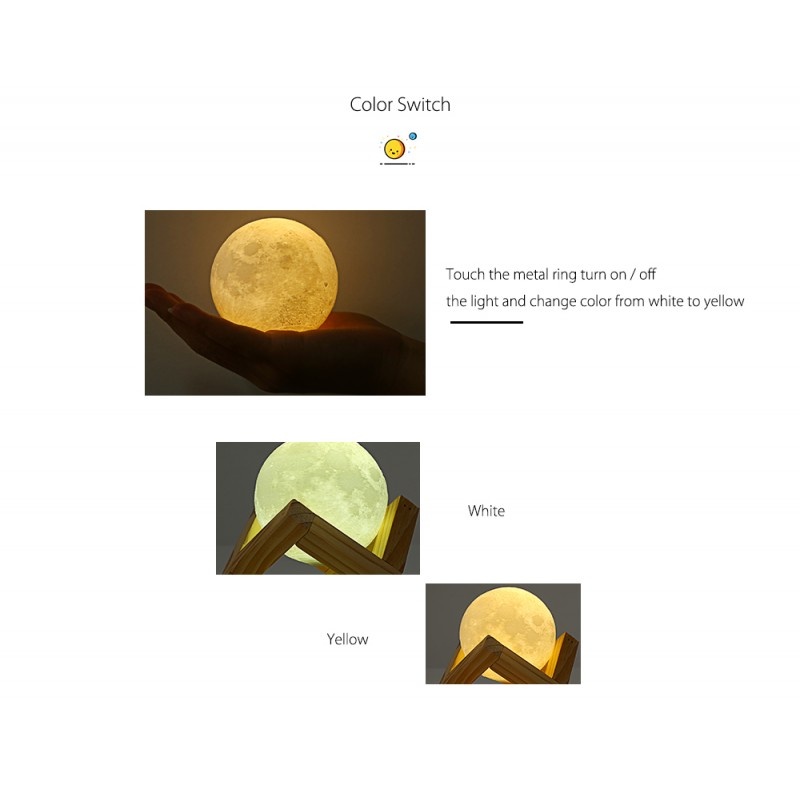 Diametrul este de 8 CM Pasi de folosire: 1. Atinge inelul de metal din josul lampii pentru a porni/opri lumina si pentru a schimba culoarea alb sau galben 2. Apasa lung inelul de metal pentru a ajusta luminozitatea 3. Daca mana ta este prea uscata sau temperatura este prea scazuta, lampa nu va raspunde comenzilor. 4. Lumina alba nu va lumina daca bateria este descarcata 5. Insereaza conectorul DC in inelul de metal pentru a se incarca, lumina rosie va fi mereu aprins cand acesta se incarca 6. Lumina rosie se va opri automat atunci cand lampa va fi incarcata complet.