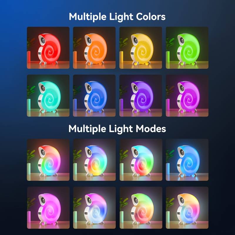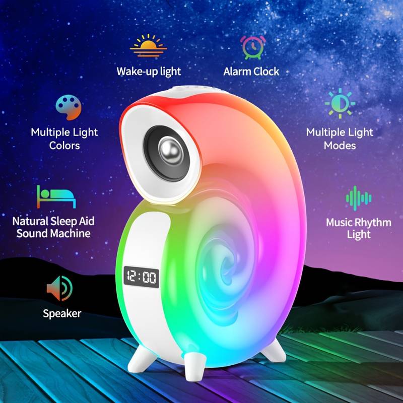 Lampa Smart RGB Bluetooth, Ceas cu alarma Joc culori in ritmul muzicii, model Melc Lumina si sunet, incarcare USB, sunete albe Lampa Smart LED RGB este un device destinat persoanelor care isi doresc o atmosfera placuta si poate fi utilizata pentru diverse activitati cu ar fi: relaxare & meditare, in timpul alaptarii, in timpul lecturii, pentru lucrul de la birou cat si pentru a avea un somn mai linistit. Acest dispozitiv include o lumina de noapte multicolora, un difuzor Bluetooth de inalta calitate, o functie de simulare a rasaritului de soare si multe altele. Este solutia suprema de relaxare. Obtineti tot ce aveti nevoie pentru o odihna perfecta intr-un singur dispozitiv. Creati-va atmosfera relaxanta ideala cu iluminarea reglabila a lampii, care ofera 256 de moduri si o gama de 16 milioane de culori. Lampa vine cu o functie de simulare a rasaritului care imita lumina soarelui care rasare, trezindu-va usor si facand trezirea mai confortabila si mai linistitoare. Boxa integrata Smart RGB Conectare prin Bluetooth Luminozitate reglabila Alarma simulare rasarit Alarma dubla - sunet si lumina 360° Surround Sound Iluminare pe ritmul muzicii sau personalizata