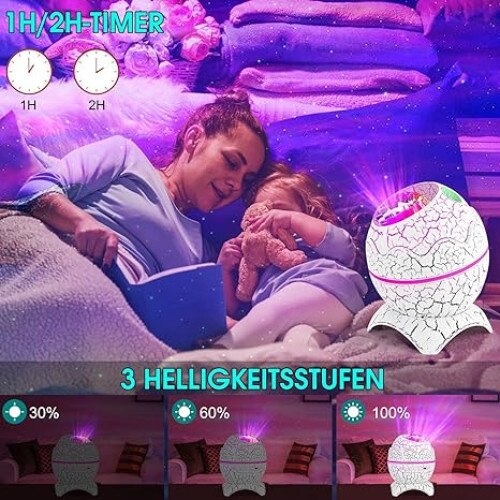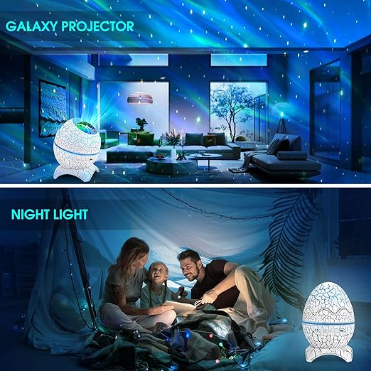 Lampa veghe copii cu Proiectie stele - Ou de dinozaur Speaker Bluetooth, lumina LED, 19 sunete albe, Rotatie 360° 14 proiectii si culori, 4 Luminozitati, Telecomanda, Functie de Cronometru Datorita designului ingenios, lampa arata ca un ou de dinozaur, iar lumina izbucneste din crapatura, de parca lumina vietii infloreste, dand un vis: micul dinozaur din interior a explodat din coaja! [Starry Sky + Northern Lights] Vizualizarea de proiectie a proiectorului ofera 14 combinatii de culori (formate din patru culori: verde, rosu, albastru si alb) care nu numai ca accepta efectul Aurora monocrom, bicolor si tricolor, dar pot aduce si efectul Aurora. cer instelat in camera, dand un sentiment de scena. Puteti aprinde sau opri cu usurinta stelele verzi si luminile aurore. Pentru proiectoare, puteti alege intre diferite culori si niveluri de viteza. Cu toate acestea, puteti alege si un mod care permite culorilor sa palpaie usor alternativ. Toate combinatiile de moduri stea si aurora sunt accesibile de pe telecomanda! Bateria (2 AAA) pentru telecomanda nu este inclusa. Conexiune Bluetooth, difuzor Bluetooth de inalta calitate, usor de utilizat. Asculta muzica cu el si activeaza si modul ritm, astfel incat luminile sa danseze pe ritmul muzicii. Proiectorul are un conector de alimentare USB - C. Tip produs Proiector Utilizat pentru Noptiera Tip alimentare La retea Material Plastic Poveste/Personaj Alte personaje Abilitati dezvoltate Invatarea si recunoasterea culorilor Ascultare Coordonare audio-vizuala Relaxarea simturilor Elimina frica de intuneric Atentia ,gandirea, imaginatia Relaxare Abilitati muzicale,atentie,culoare Va ajuta sa-si fixeze atentia si sa se relaxeze inainte de a adormi sau in timpul noptii Creaza o atmosfera familiala de relaxare si siguranta Indeparteaza temerile. Insoteste bebelusul la culcare, creand un mediu familiar relaxant si sigur, care invita la somn Continut pachet 1 x Manual utilizare 1 x Telecomanda 1 x Cablu USB 1 x Lampa de veghe proiector stele Ou de Dinozaur 1 x Carte de colorat cu abtibilduri Detalii tehnice Tip soclu 0 h Putere 8 W Voltaj 220 V Baterii necesare 1 acumulator inclus Autonomie baterie 1 h Lungime cablu 0.5 Lungime 12 cm Latime 12 cm Inaltime 16 cm Greutate 560 g