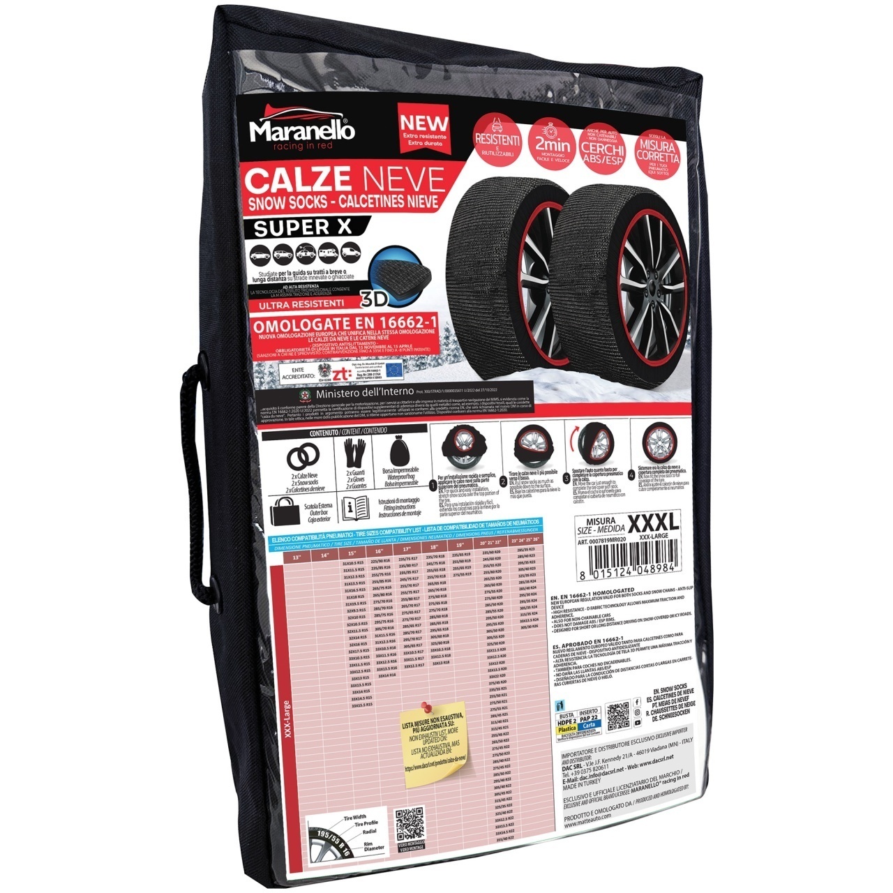 Maranello Super X marime XL pentru anvelope 255/45 R19 , lanturi auto textile, huse antiderapante pentru masina ta Maranello Super X este cea mai noua generatie de huse antiderapante textile, acum cu omologare europeana EN 16662-1 , standard care unifica si echivaleaza legal husele textile cu lanturile de zapada. Acest lucru garanteaza siguranta, performanta si conformitate in toate tarile Uniunii Europene. Performanta si rezistenta superioara Structura inovatoare din tesatura 3D de inalta densitate asigura tractiune si aderenta exceptionala pe zapada si gheata. Comparativ cu seria Active, Maranello Super X ofera +50% rezistenta si +50% durabilitate fata de generatia DAC ACTIVE SERIES , fiind concepute pentru drumuri dificile de iarna. Montaj rapid si usor Se monteaza in doar 2 minute , mult mai rapid decat lanturile metalice. Structura cu auto-centrare fixeaza singura husa pe anvelopa dupa montaj. Se instaleaza pe rotile cu tractiune ale vehiculului. Confort si compatibilitate extinsa Maranello Super X este solutia ideala inclusiv pentru vehiculele ne-lantabile (care nu dispun de spatiu intre roata si amortizor pentru lanturi metalice). Nu deterioreaza cauciucurile sau jantele. Nu produc vibratii sau zgomote la rulare. Recomandare de viteza: maxim 30 km/h pe zapada sau gheata. Pot fi spalate manual la max. 30° si reutilizate. Design compact, usor de depozitat in husa impermeabila inclusa. Acoperire extinsa pentru parcul auto Maranello Super X este disponibil in 6 dimensiuni , compatibile cu 95% din autoturismele aflate in circulatie . LISTA COMPATIBILITATE DIMENSIUNI DE ANVELOPE/CAUCIUCURI (Consultati inainte de a achizitiona produsul) Lanturile se potrivesc pentru urmatoarele dimensiuni de anvelope: 13 14 15 16 17 18 19 20 21 22 23 24 25 26 X-Large 215/80 R14 195/80 R15 175/80 R16 185/70 R17 215/55 R18 155/70 R19 175/55 R20 235/70 R14 195/85 R15 185/80 R16 195/75 R17 215/60 R18 175/60 R19 195/50 R20 265/70 R14 205/75 R15 195/75 R16 205/65 R17 225/55 R18 195/50 R19 195/55 R20 205/80 R15 195/80 R16 205/75 R17 225/60 R18 205/50 R19 235/30 R20 215/75 R15 195/85 R16 215/60 R17 235/50 R18 205/55 R19 235/35 R20 215/80 R15 205/70 R16 215/65 R17 235/55 R18 215/50 R19 235/40 R20 225/70 R15 205/75 R16 215/70 R17 235/60 R18 225/45 R19 235/45 R20 225/75 R15 205/80 R16 225/60 R17 245/50 R18 225/50 R19 235/50 R20 235/70 R15 215/65 R16 225/65 R17 245/55 R18 225/55 R19 245/40 R20 235/75 R15 215/70 R16 235/55 R17 255/45 R18 235/45 R19 245/45 R20 255/60 R15 215/75 R16 235/60 R17 255/50 R18 235/50 R19 255/35 R20 255/65 R15 225/65 R16 235/65 R17 255/55 R18 235/55 R19 255/40 R20 255/70 R15 225/70 R16 245/55 R17 265/45 R18 245/45 R19 255/45 R20 275/60 R15 225/75 R16 255/50 R17 275/45 R18 245/50 R19 265/35 R20 235/60 R16 255/55 R17 255/40 R19 265/40 R20 235/65 R16 255/60 R17 255/45 R19 275/35 R20 235/70 R16 265/55 R17 255/50 R19 275/40 R20 245/60 R16 275/55 R17 265/40 R19 285/30 R20 255/65 R16 275/40 R19 295/35 R20 265/60 R16 275/45 R19 285/35 R20 285/40 R20 295/40 R20 235/45 R21 245/35 R21 245/40 R21 255/40 R21 265/35 R21 275/30 R21 275/35 R21 295/35 R21 Omologarea EN 16662-1:2020 reprezintă o standardizare europeană pentru echipamentele antiderapante utilizate pe drumurile acoperite cu zăpadă sau gheață, cum ar fi lanțurile textile, lanțurile metalice sau alte dispozitive similare. Aceasta garantează că produsele respectă cerințele tehnice și de siguranță stabilite de Uniunea Europeană. Iată ce implică această omologare: 1. Siguranță și Performanță Standardul verifică eficiența produselor în condiții reale de utilizare, asigurând că acestea oferă aderența necesară pe suprafețe alunecoase fără a compromite siguranța șoferului sau a vehiculului. 2. Compatibilitate cu Vehiculul EN 16662-1:2020 include cerințe privind modul în care dispozitivele antiderapante interacționează cu roțile vehiculului. Se verifică dacă: Nu afectează sistemele de frânare (ex. ABS, ESP). Nu deteriorează anvelopele sau jantele. 3. Calitate Materiale Materialele utilizate trebuie să fie rezistente la uzură, să nu deterioreze suprafețele carosabile și să fie sigure pentru utilizator. 4. Ușurință în Instalare și Demontare Standardul specifică și că echipamentele trebuie să fie ușor de montat și demontat, chiar și în condiții dificile (frig, zăpadă, gheață). 5. Conformitate Legală în Europa Dispozitivele care au omologarea EN 16662-1:2020 sunt acceptate legal în toate țările din Uniunea Europeană, inclusiv în zonele unde utilizarea echipamentelor antiderapante este obligatorie în sezonul de iarnă. Pentru produsele omologate conform acestui standard, clienții pot fi siguri că achiziționează un produs de înaltă calitate, potrivit cerințelor europene de siguranță și eficiență.